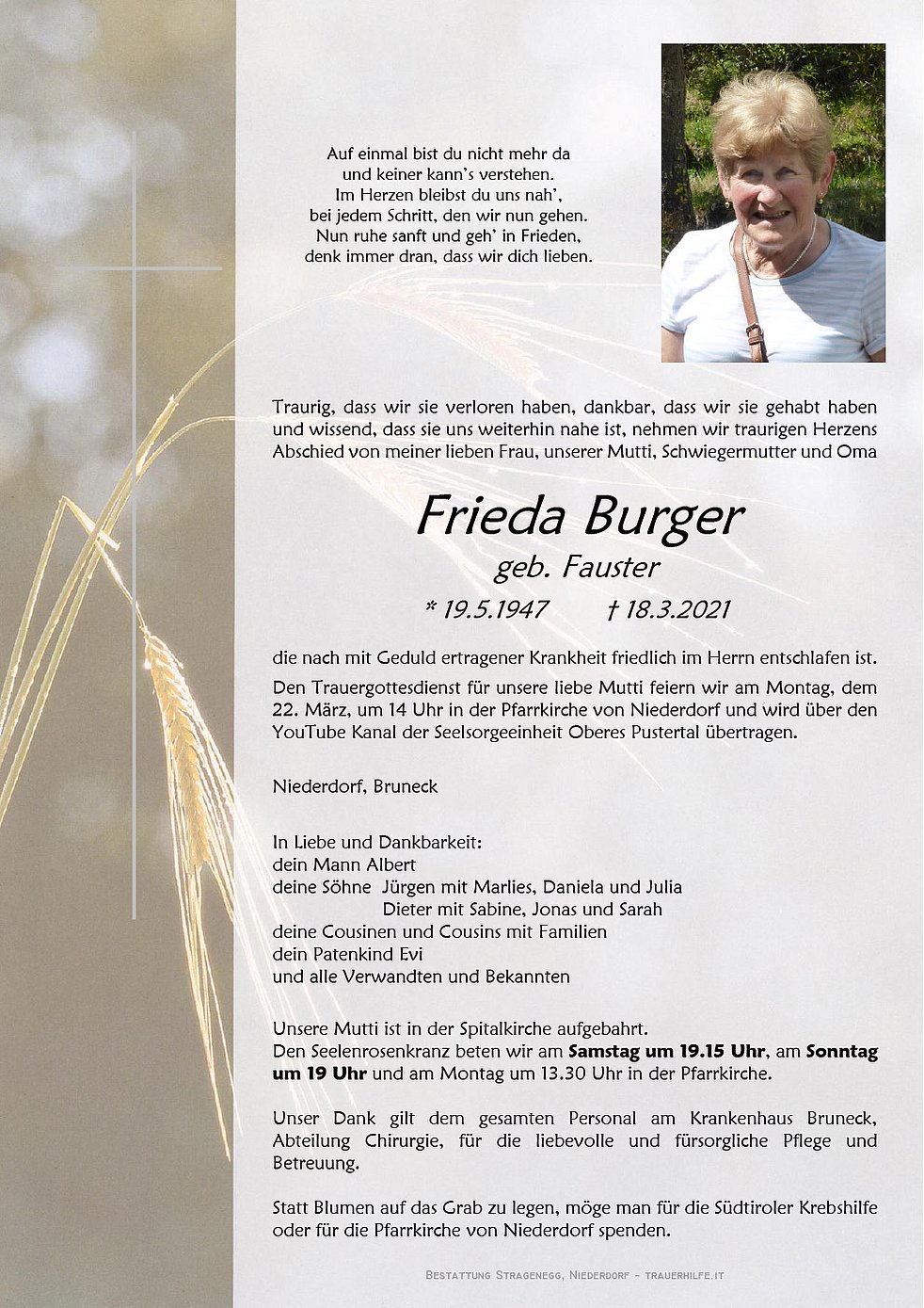Den Trauergottesdienst für unsere liebe Mutti feiern wir am Montag, dem 22. März, um 14 Uhr in der Pfarrkirche von Niederdorf und wird über den YouTube Kanal der Seelsorgeeinheit Oberes Pustertal übertragen.