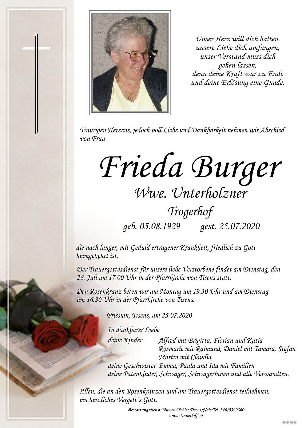 Der Trauergottesdienst für unsere liebe Verstorbene findet am Dienstag, den