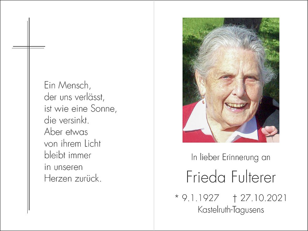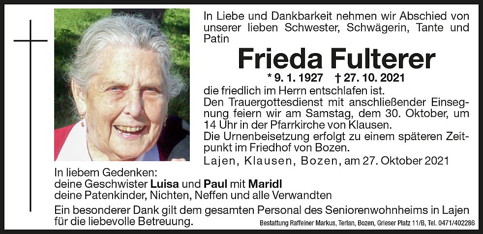 Den Trauergottesdienst mit anschließender Einsegnung feiern wir am Samstag, dem 30. Oktober, um 14 Uhr in der Pfarrkirche von Klausen.