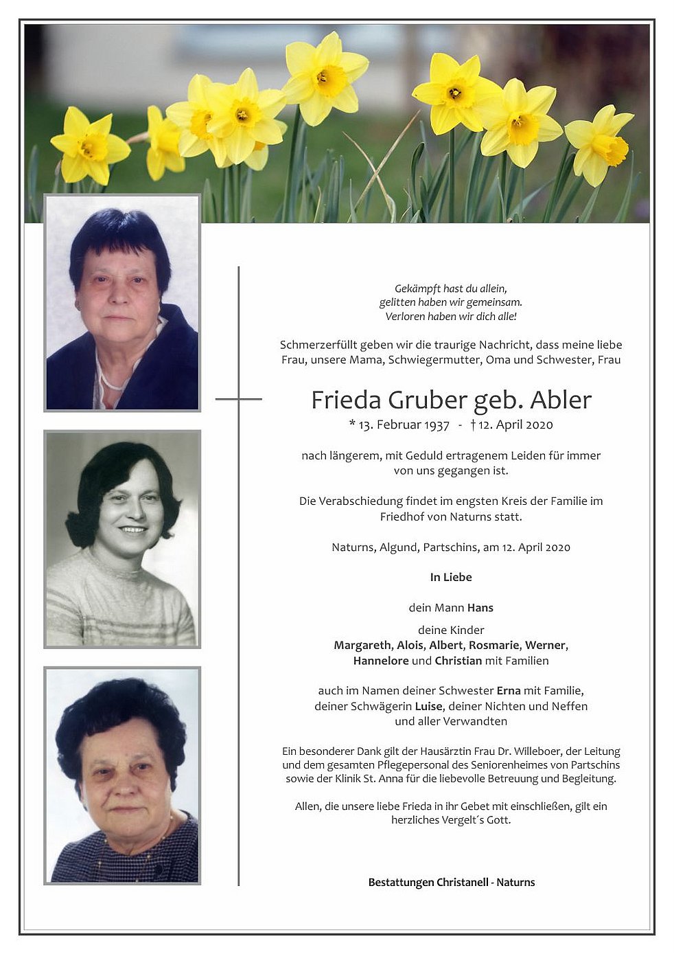 Allen, die unsere liebe Frieda in ihr Gebet mit einschließen, gilt ein herzliches Vergelt´s Gott.