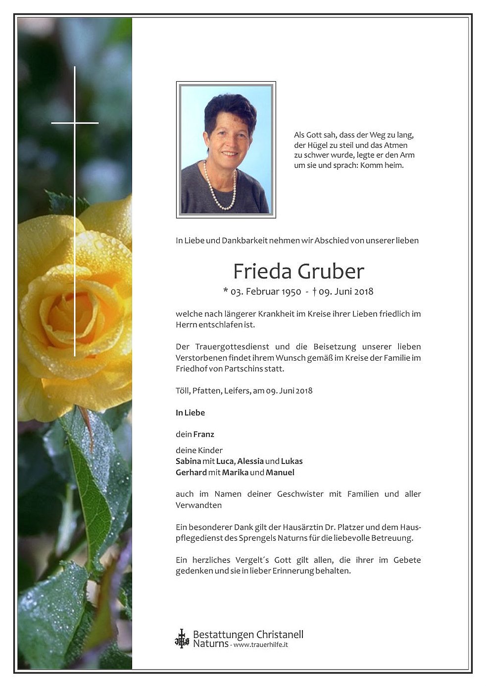 Der Trauergottesdienst und die Beisetzung unserer lieben Verstorbenen findet ihrem Wunsch gemäß im Kreise der Familie im Friedhof von Partschins statt.