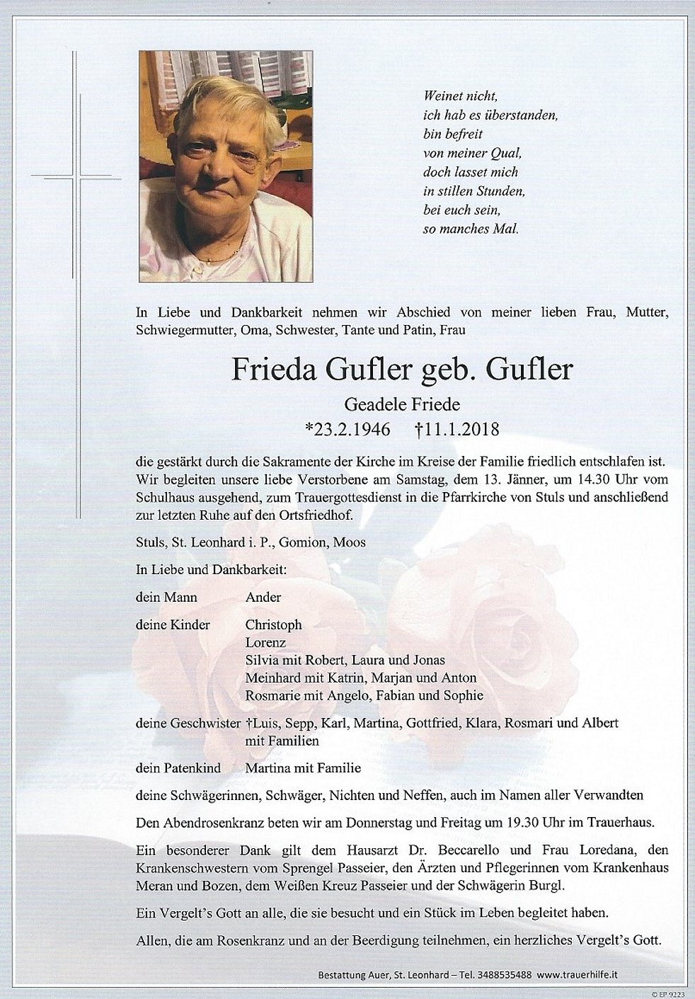 Wir begleiten unsere liebe Verstorbene am Samstag, dem 13. Jänner, um 14.30 Uhr vom Schulhaus ausgehend, zum Trauergottesdienst in die Pfarrkirche von Stuls und anschließend zur letzten Ruhe auf den Ortsfriedhof.