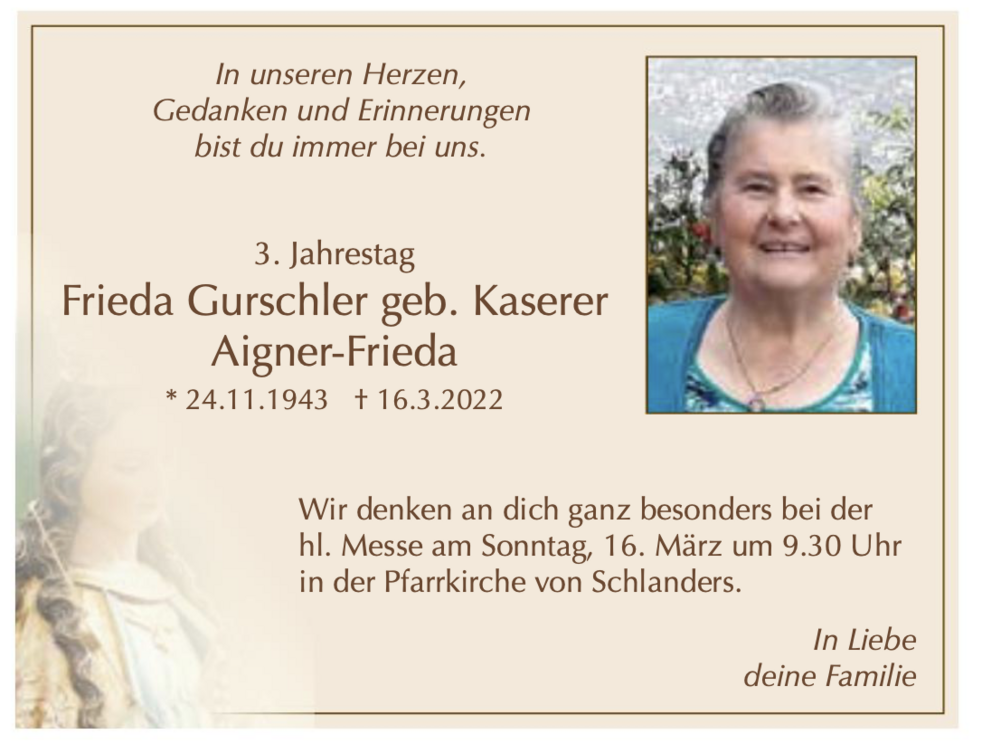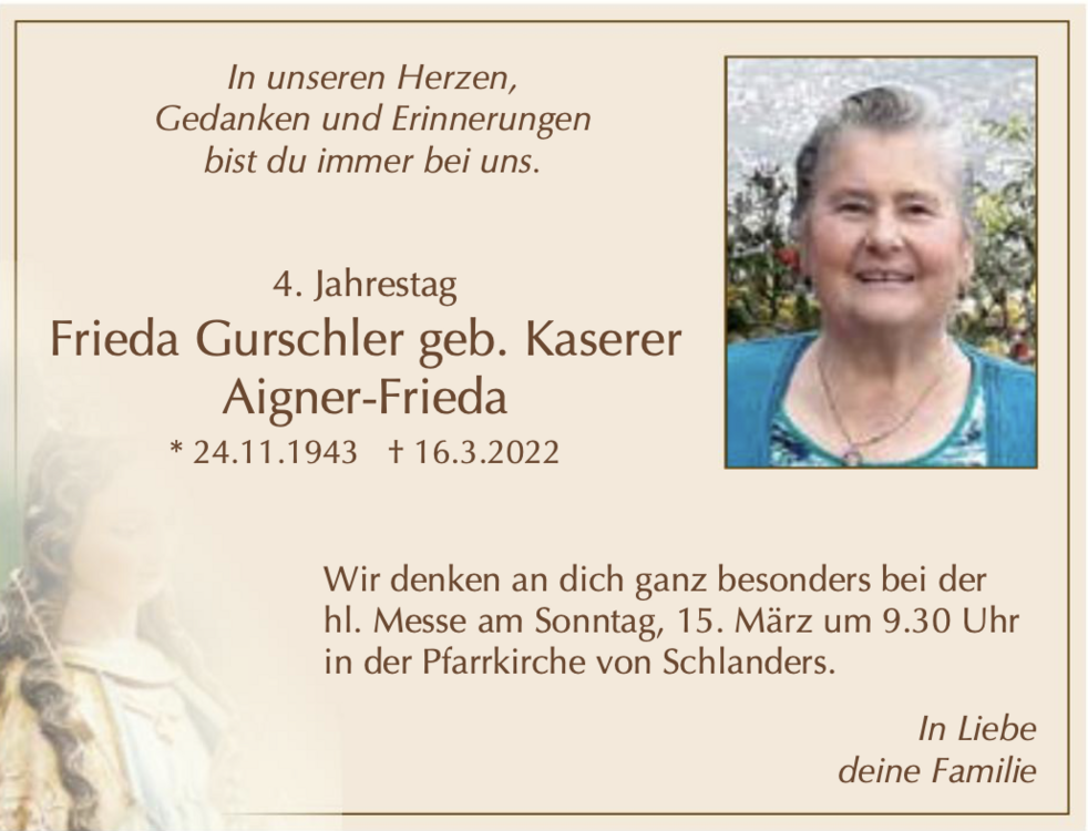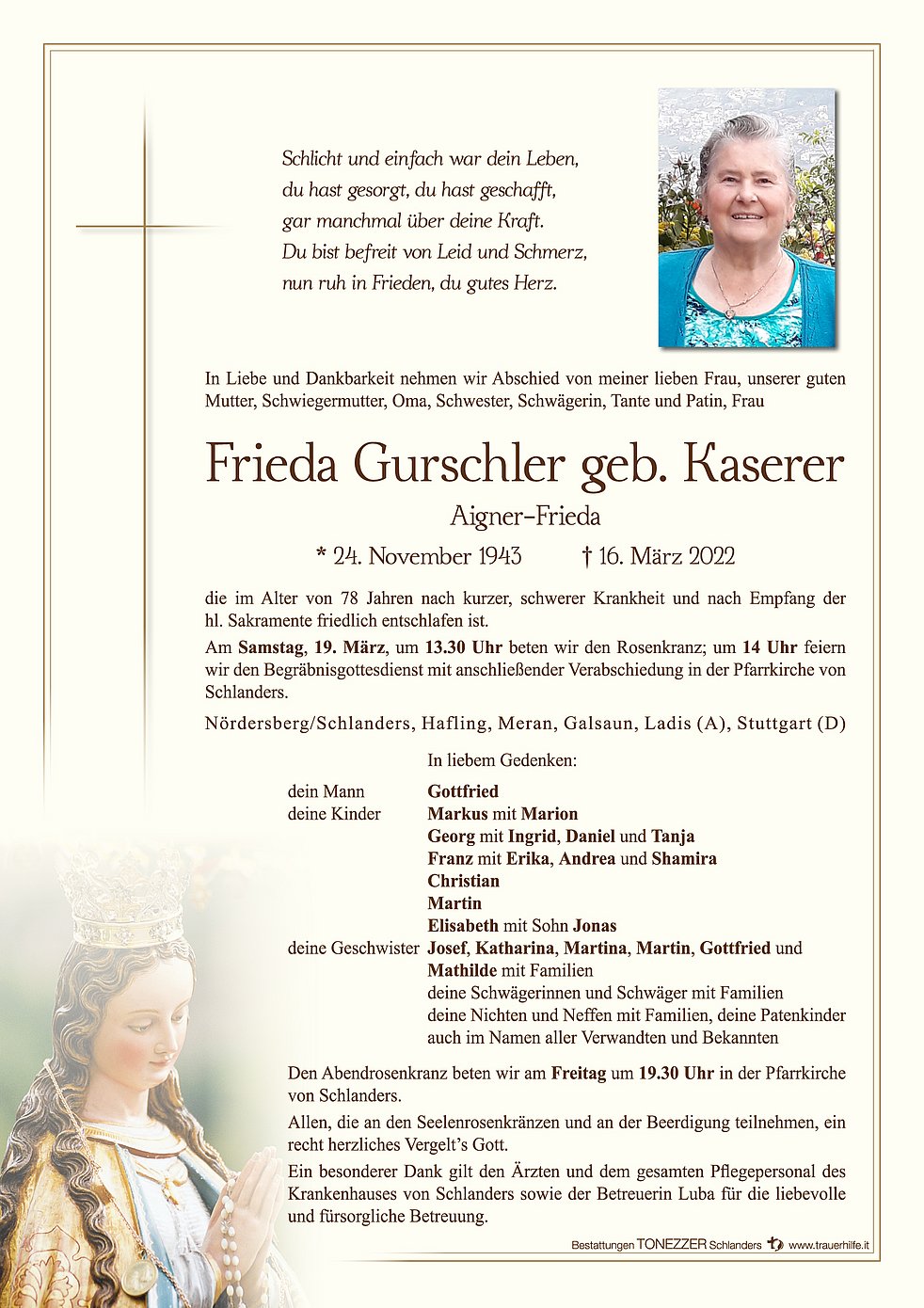 Am Samstag, 19. März, um 13.30 Uhr beten wir den Rosenkranz; um 14 Uhr feiern wir den Begräbnisgottesdienst mit anschließender Verabschiedung in der Pfarrkirche von Schlanders.