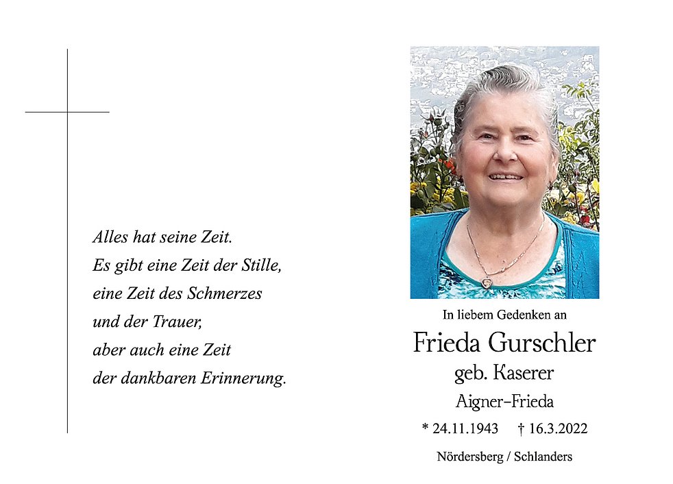 In Liebe und Dankbarkeit nehmen wir Abschied von meiner lieben Frau, unserer guten Mutter, Schwiegermutter, Oma, Schwester, Schwägerin, Tante und Patin, Frau
