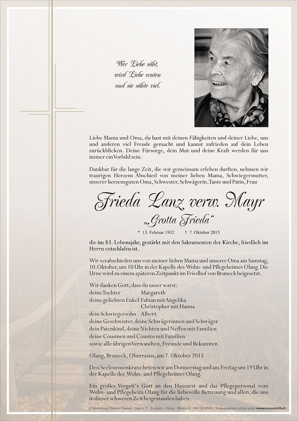 Wir verabschieden uns von meiner lieben Mama und unserer Oma am Samstag, 10.Oktober, um 10 Uhr in der Kapelle des Wohn- und Pflegeheimes Olang. Die Urne wird zu einem späteren Zeitpunkt im Friedhof von Bruneck beigesetzt.