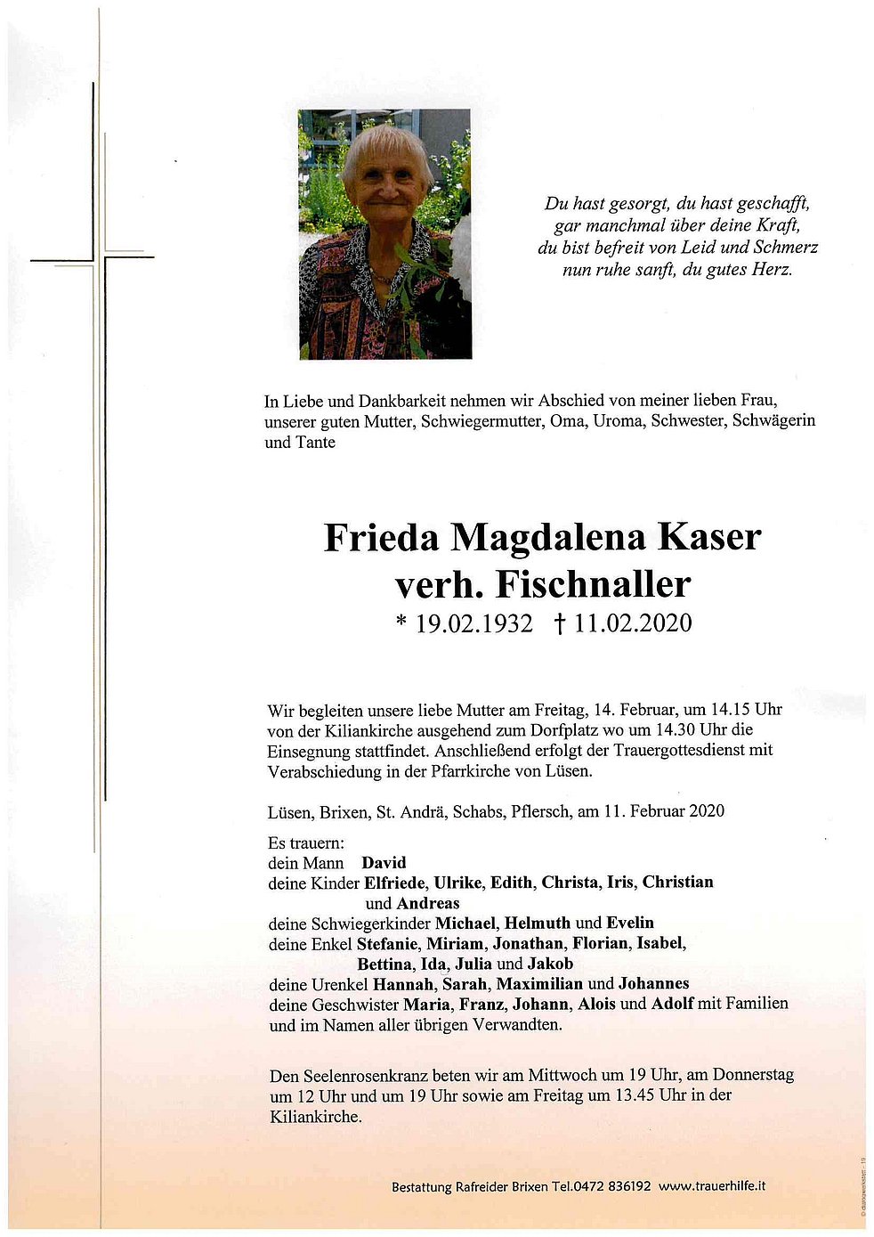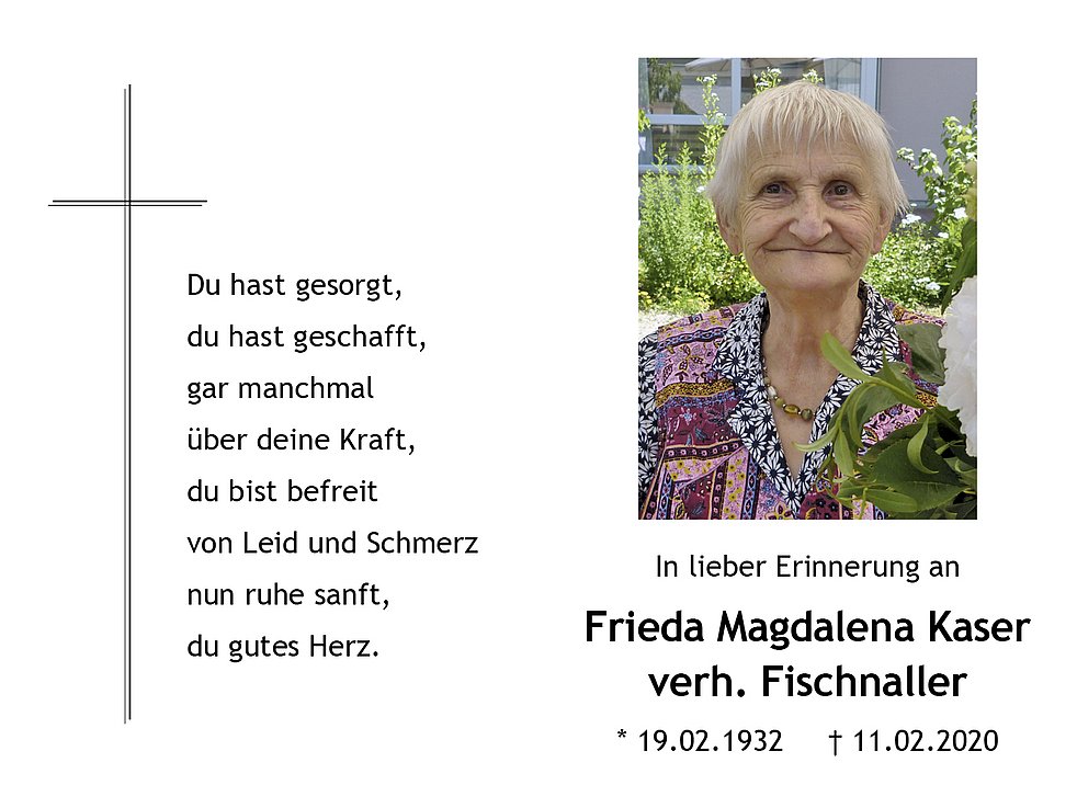 Wir begleiten unsere liebe Mutter am Freitag, 14. Februar, um 14.15 Uhr von der Kiliankirche ausgehend zum Dorfplatz wo um 14.30 Uhr die Einsegnung stattfindet. Anschließend erfolgt der Trauergottesdienst mit Verabschiedung in der Pfarrkirche von Lüsen.