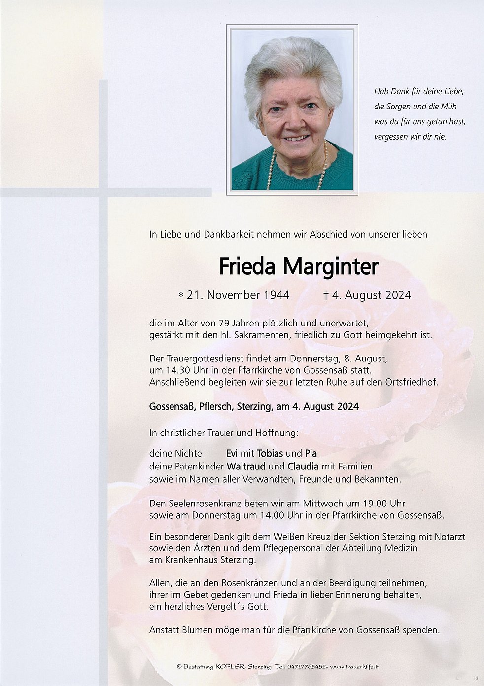 Der Trauergottesdienst findet am Donnerstag, 8. August, um 14.30 Uhr in der Pfarrkirche von Gossensaß statt. Anschließend begleiten wir sie zur letzten Ruhe auf den Ortsfriedhof.