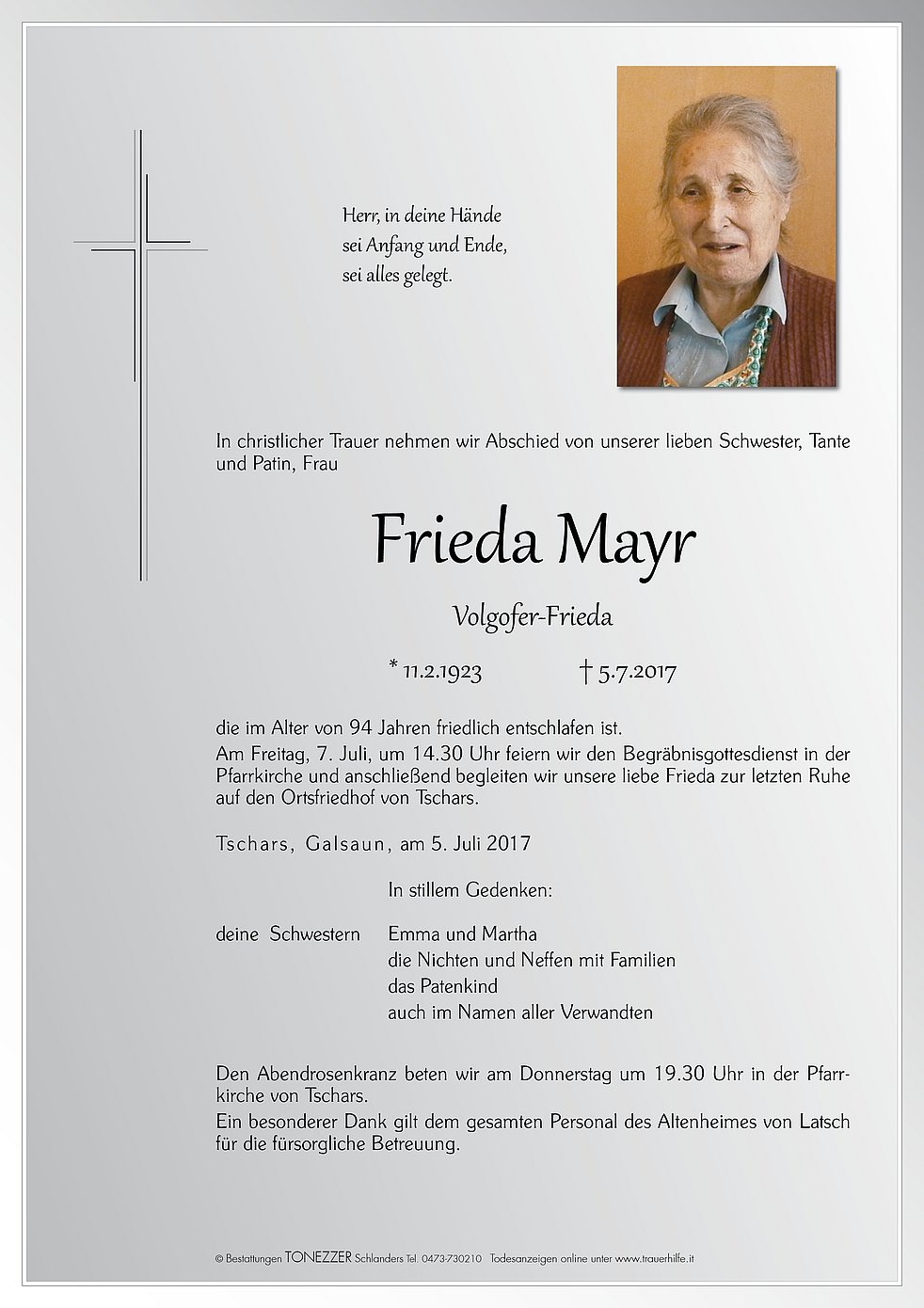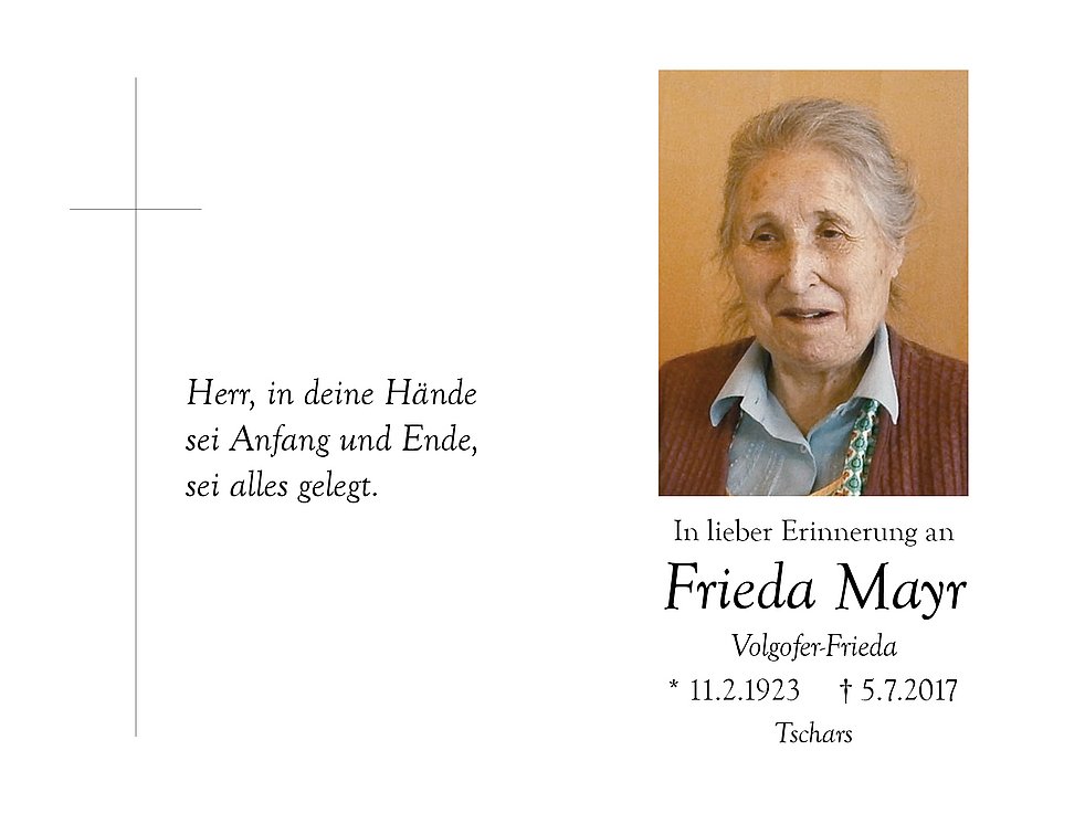 Am Freitag, 7. Juli, um 14.30 Uhr feiern wir den Begräbnisgottesdienst in der Pfarrkirche und anschließend begleiten wir unsere liebe Frieda zur letzten Ruhe auf den Ortsfriedhof von Tschars.