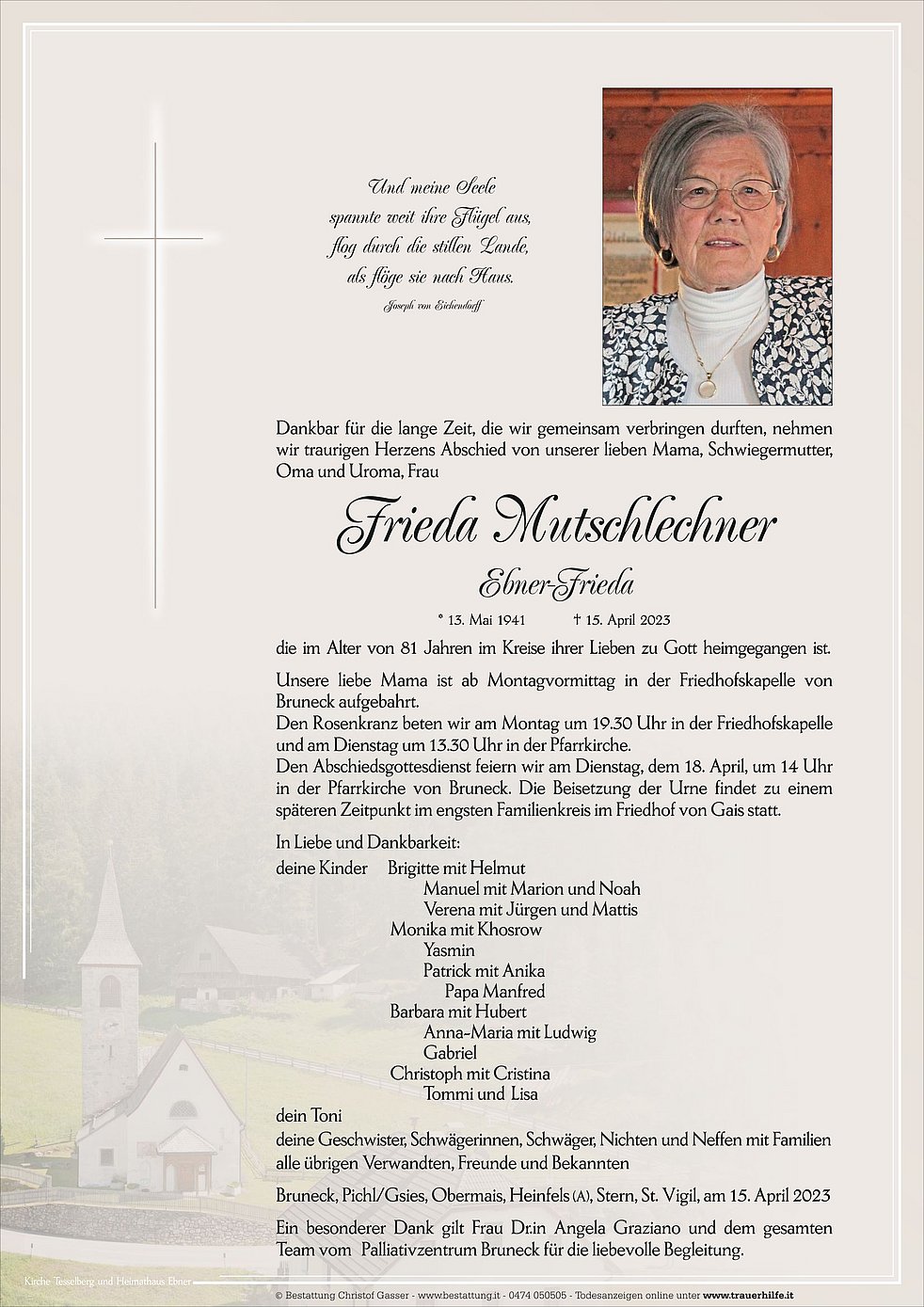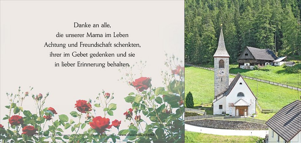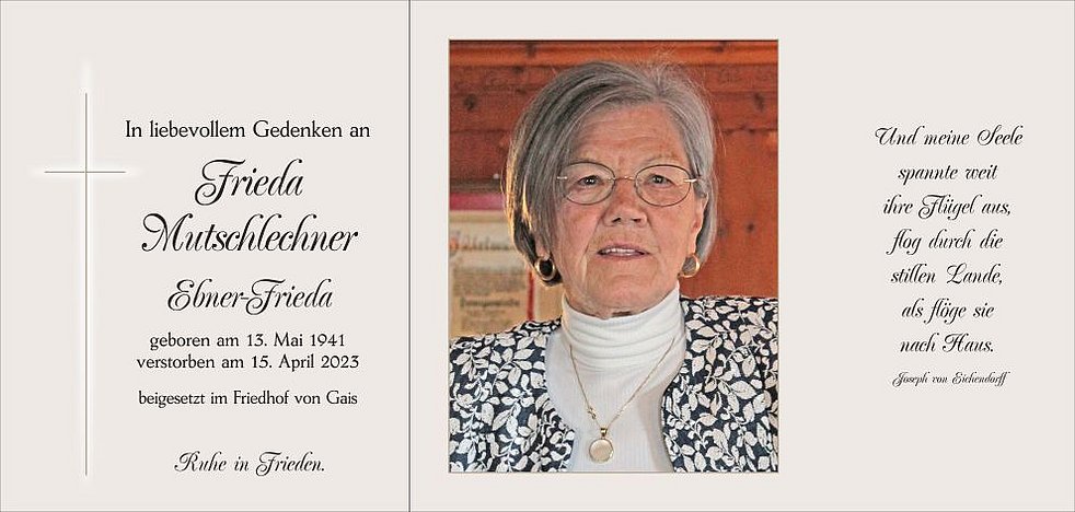 Den Abschiedsgottesdienst feiern wir am Dienstag, dem 18. April, um 14 Uhr in der Pfarrkirche von Bruneck. Die Beisetzung der Urne findet zu einem späteren Zeitpunkt im engsten Familienkreis im Friedhof von Gais statt.