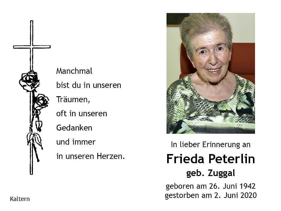 Unsere liebe Verstorbene ist von Donnerstag bis Samstagmittag in der Friedhofskapelle Kaltern aufgebahrt.