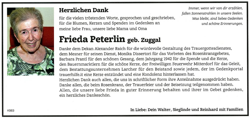 Allen, die am Rosenkranz und an der Beerdigung teilnehmen, sowie unsere liebe Verstorbene in Erinnerung behalten, ein herzliches Vergelt´s Gott.