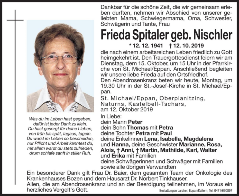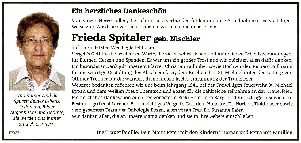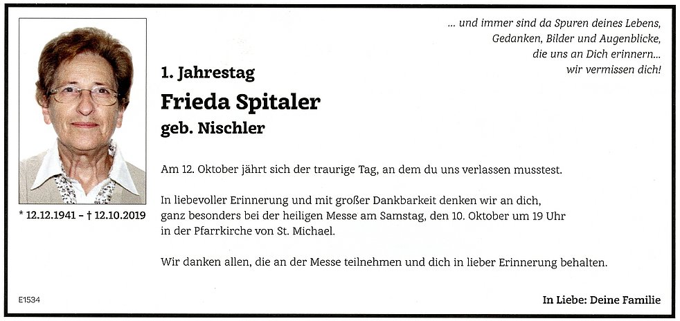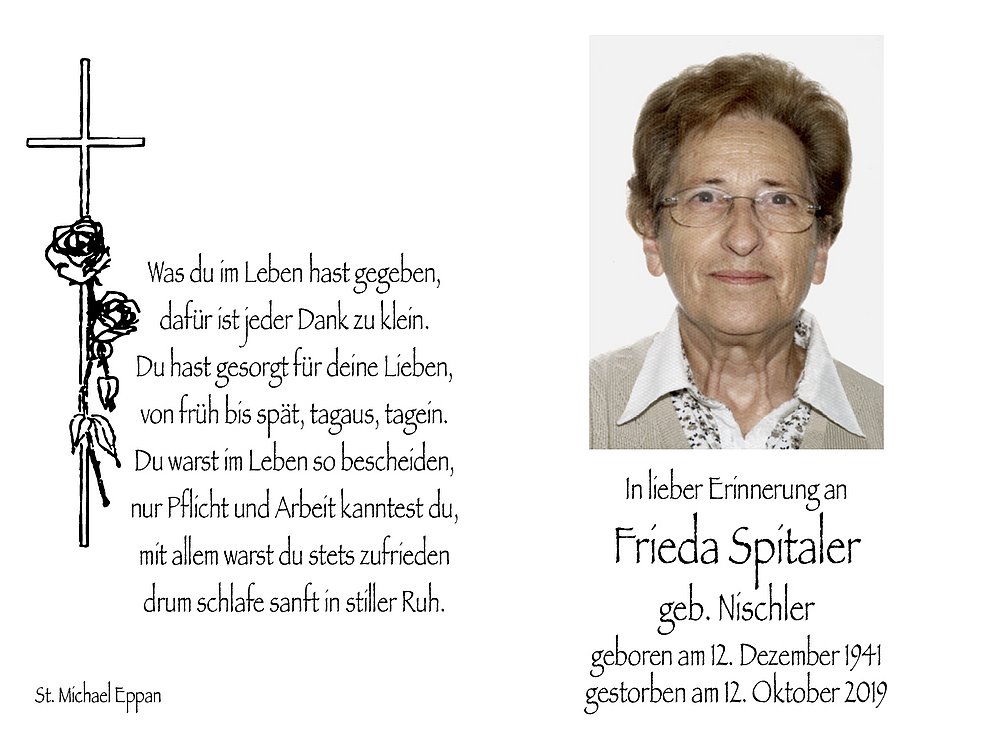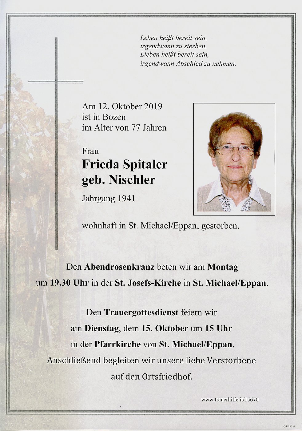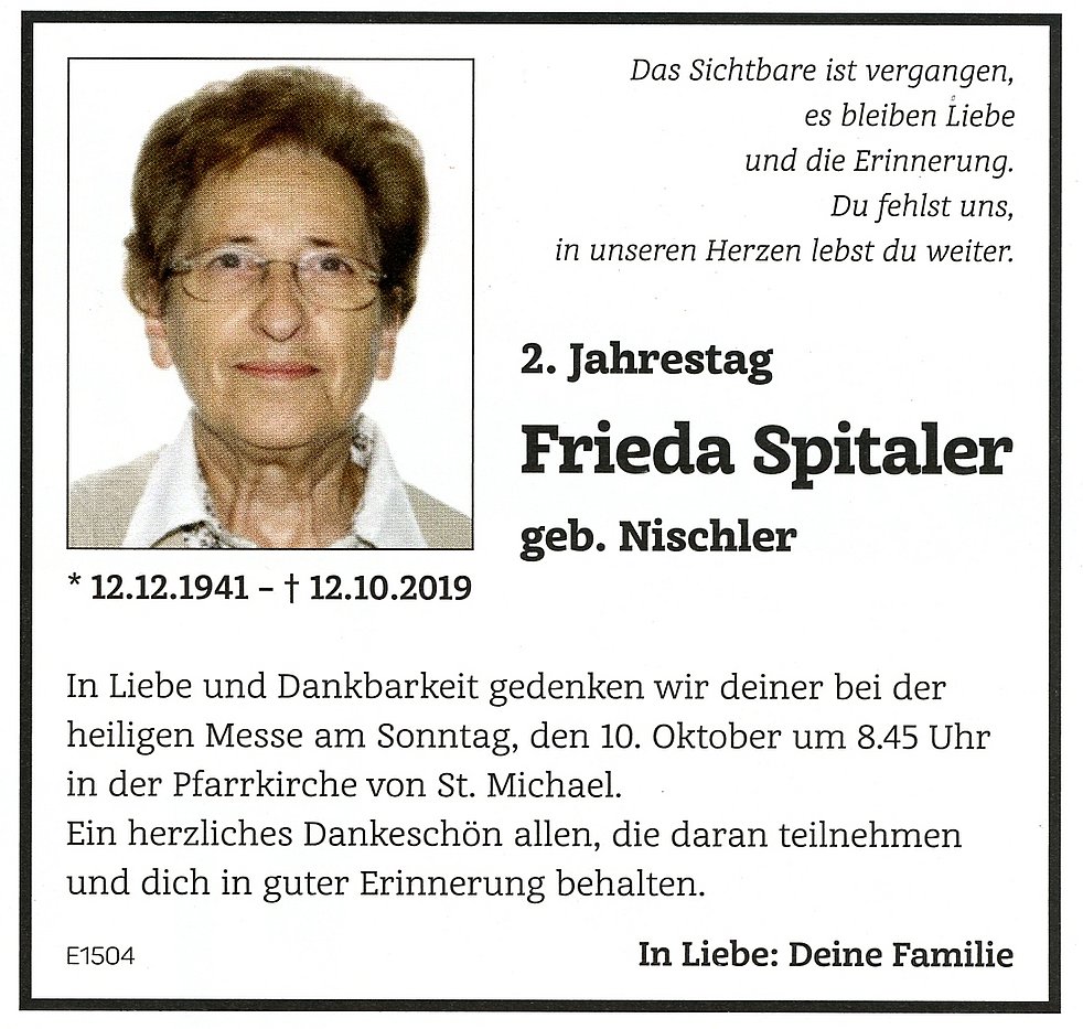 Den Trauergottesdienst feiern wir am Dienstag dem 15. Oktober um 15 Uhr in der Pfarrkirche von St. Michael/Eppan.