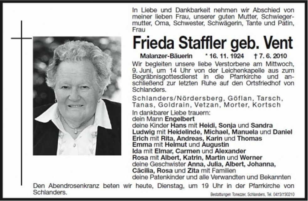 Wir begleiten unsere liebe Verstorbene am Mittwoch, 9. Juni, um 14 Uhr von der Leichenkapelle aus zum Begräbnisgottesdienst in die Pfarrkirche und anschließend zur letzten Ruhe auf den Ortsfriedhof von Schlanders.