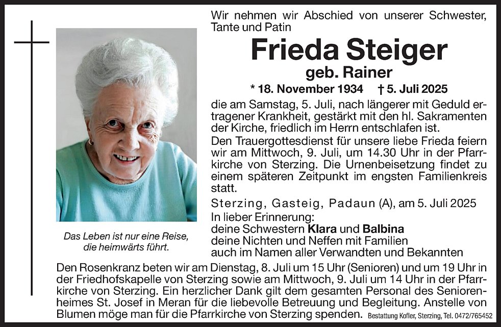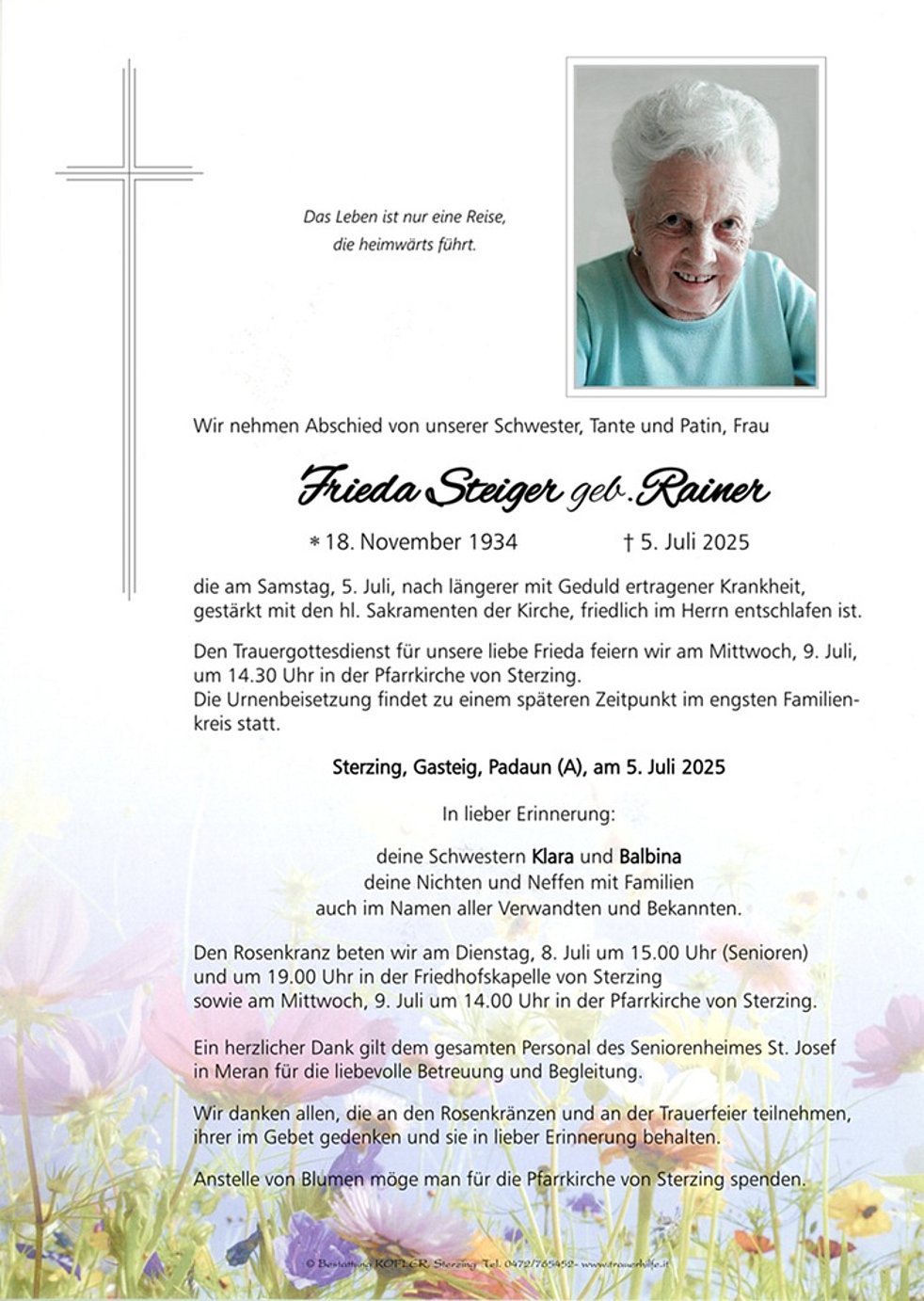 Den Trauergottesdienst für unsere liebe Frieda feiern wir am Mittwoch, 9. Juli, um 14.30 Uhr in der Pfarrkirche von Sterzing.