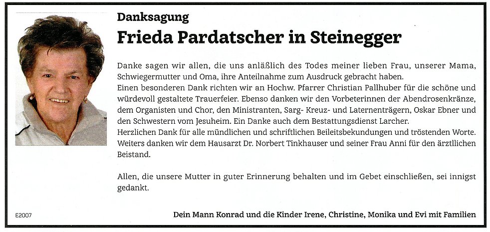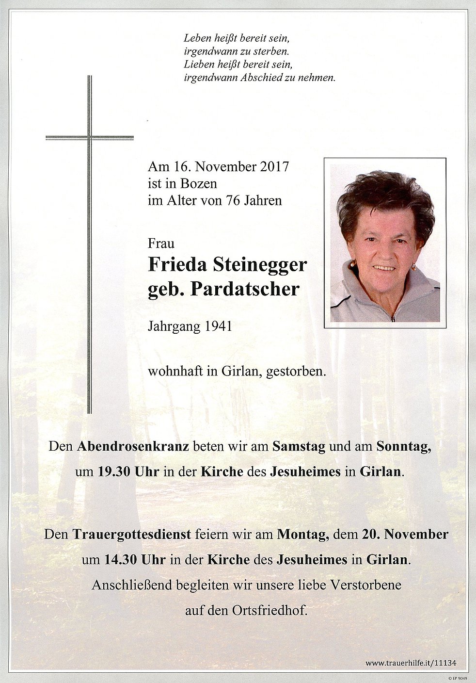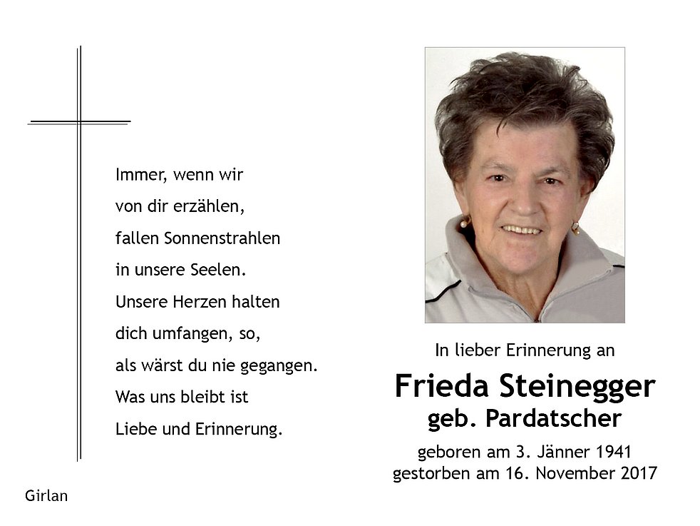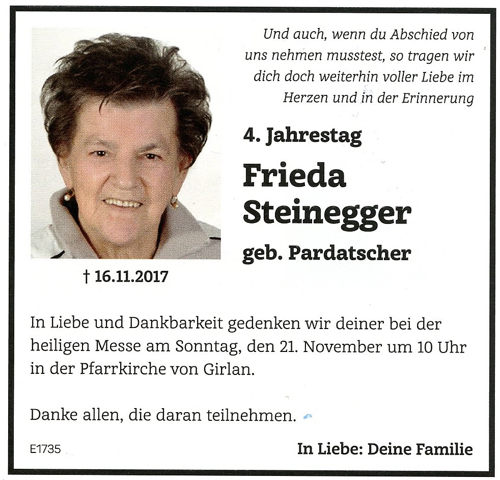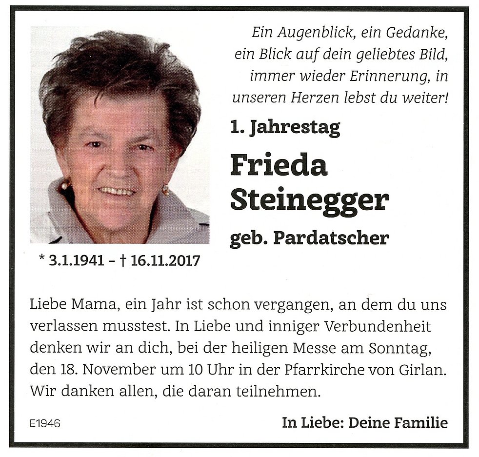 Den Trauergottesdienst feiern wir am Montag, den 20. November um 14.30 Uhr in der Kirche im Jesuheim Girlan. Anschließend begleiten wir unsere liebe Verstorbene auf den Ortsfriedhof.