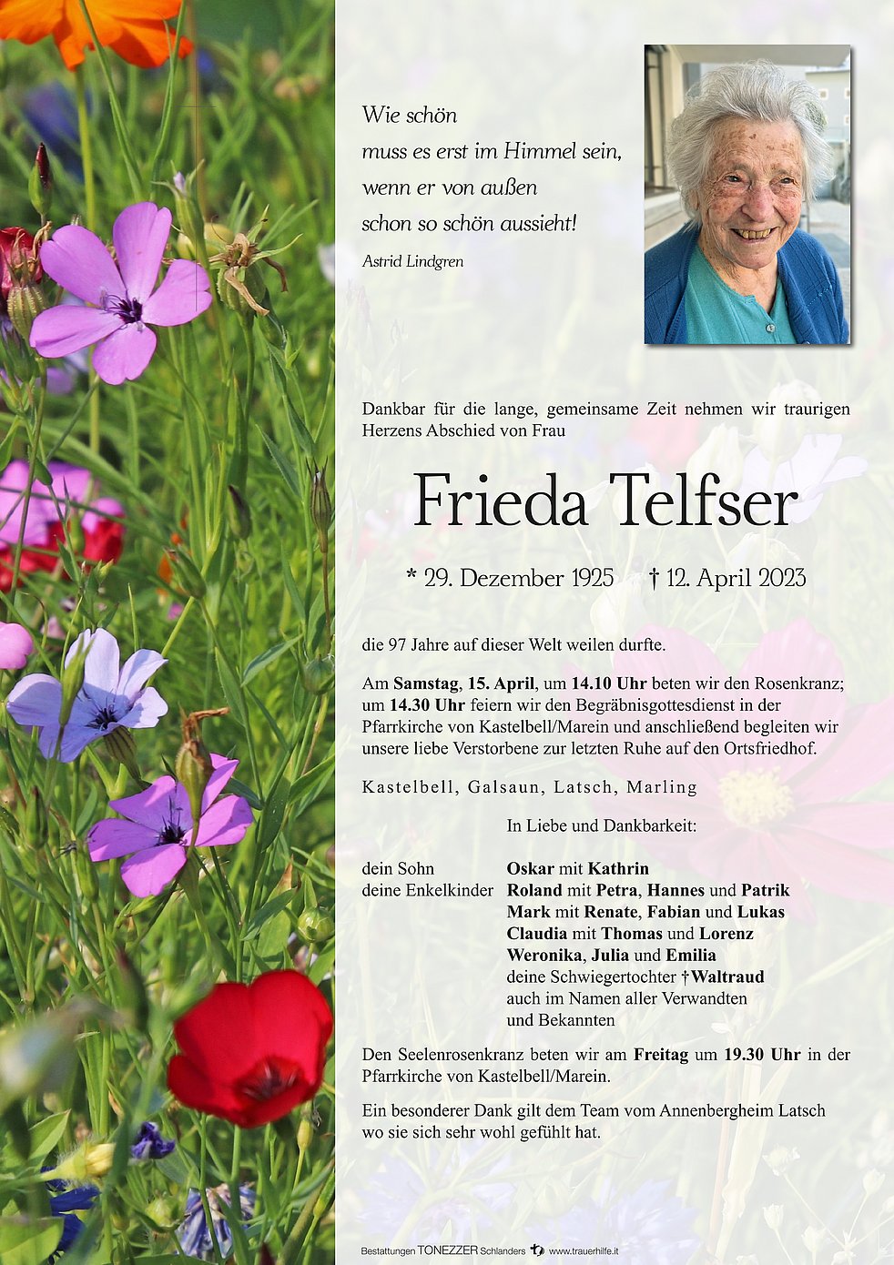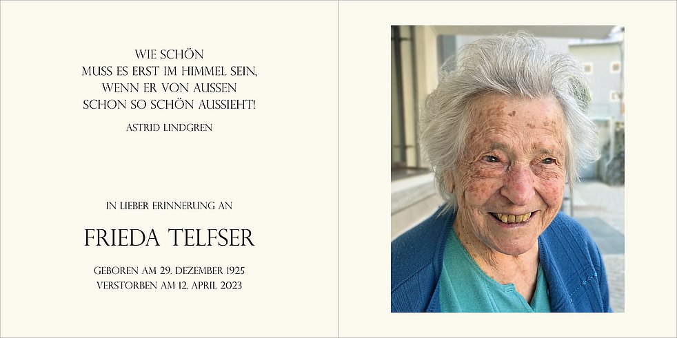 Am Samstag, 15. April, um 14.10 Uhr beten wir den Rosenkranz; um 14.30 Uhr feiern wir den Begräbnisgottesdienst in der Pfarrkirche von Kastelbell/Marein und anschließend begleiten wir unsere liebe Verstorbene zur letzten Ruhe auf den Ortsfriedhof.