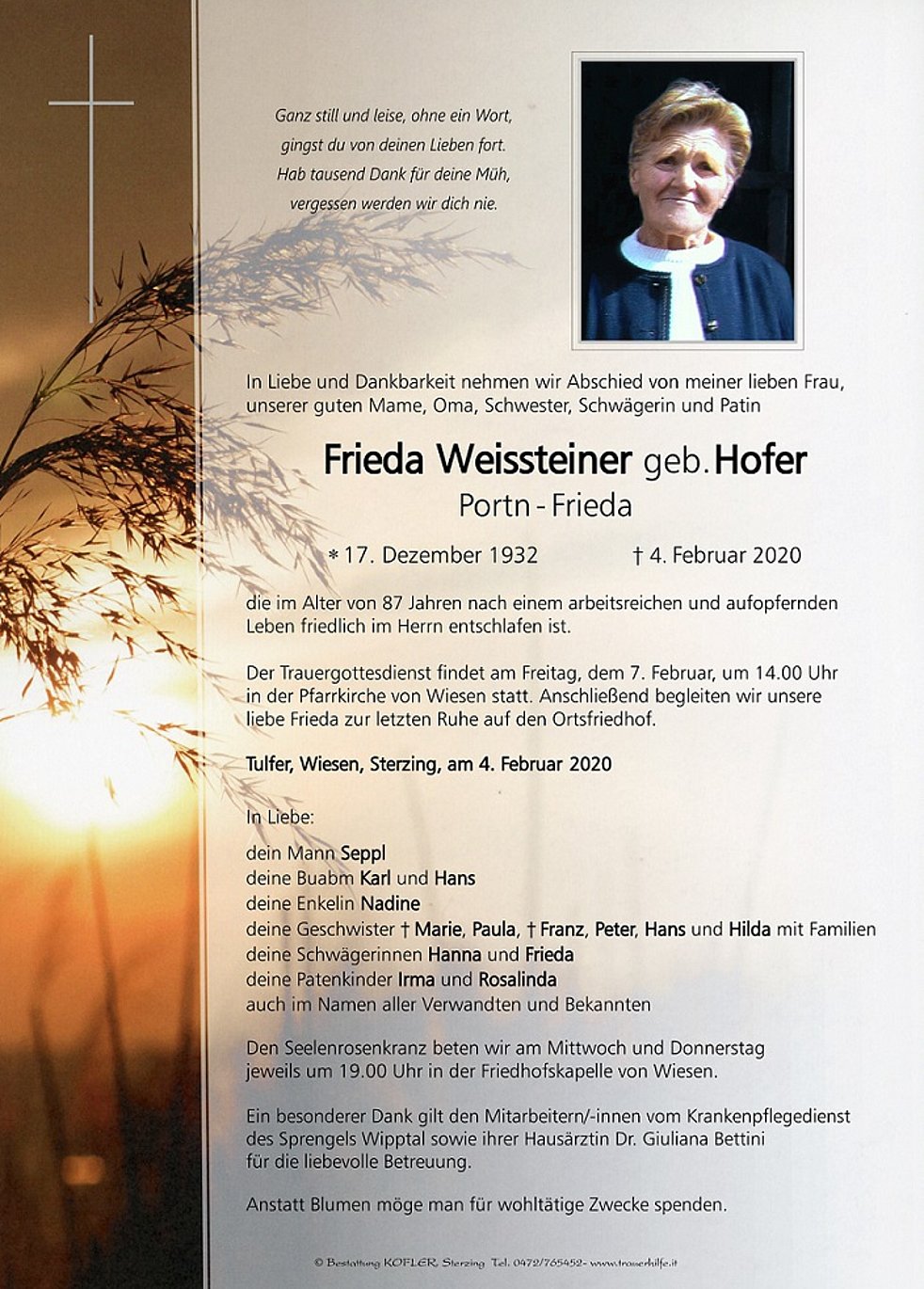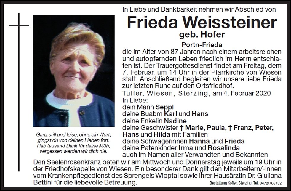 Der Trauergottesdienst findet am Freitag, dem 7. Februar, um 14.00 Uhr in der Pfarrkirche von Wiesen statt. Anschließend begleiten wir unsere liebe Frieda zur letzten Ruhe auf den Ortsfriedhof.