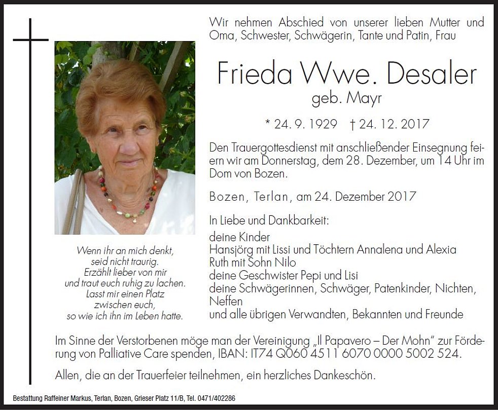 Im Sinne der Verstorbenen möge man der Vereinigung Il Papavero-Der Mohn, zur Förderung von Palliative Care spenden. IBAN: IT74 Q060 4511 6070 0000 5002 524