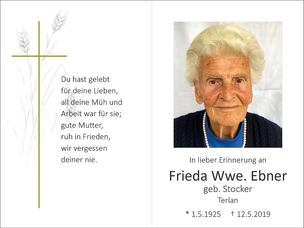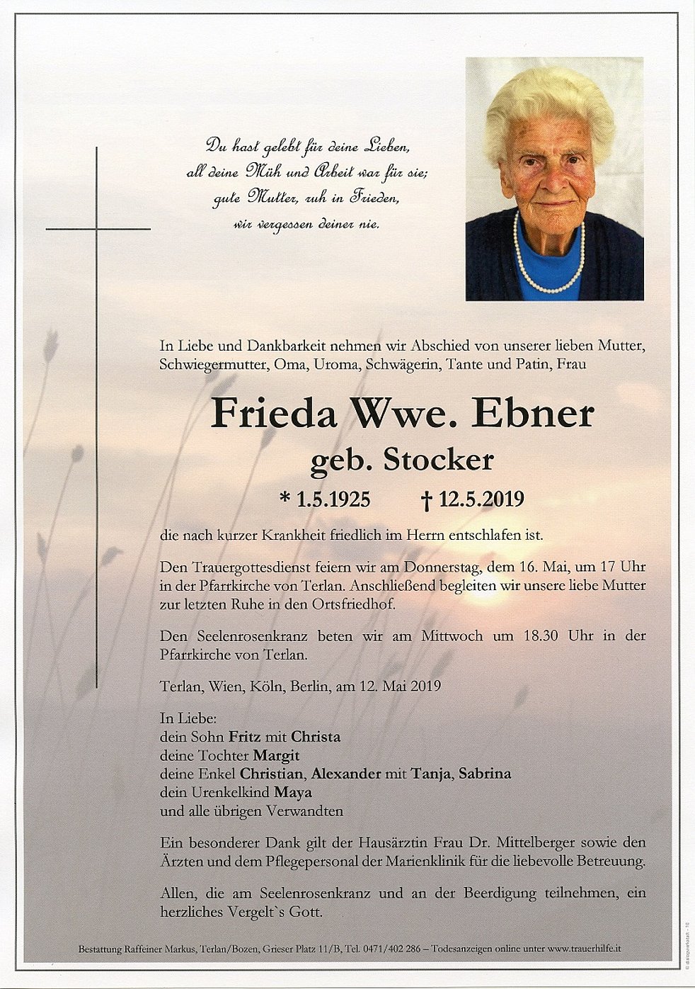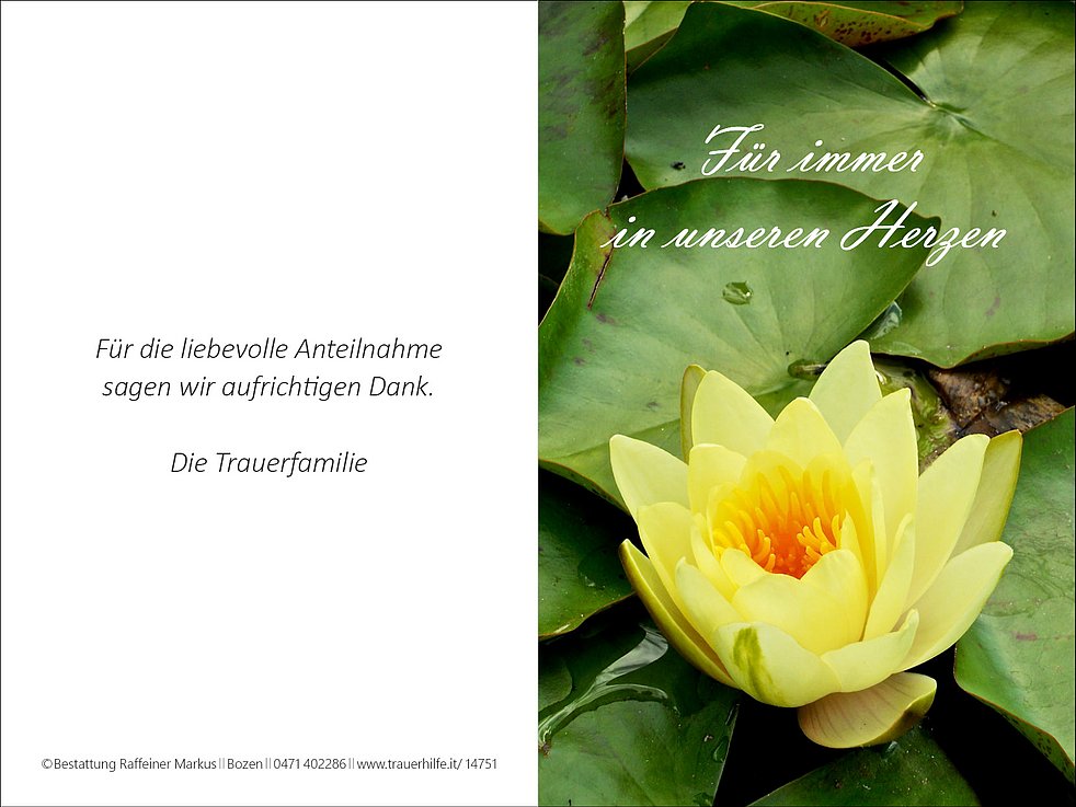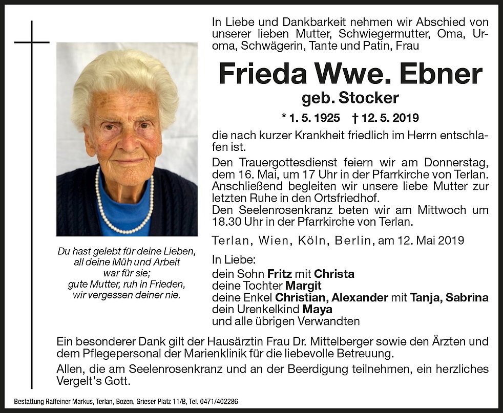 Den Trauergottesdienst feiern wir am Donnerstag, dem 16. Mai, um 17 Uhr in der Pfarrkirche von Terlan. Anschließend begleiten wir unsere liebe Mutter zur letzten Ruhe in den Ortsfriedhof.