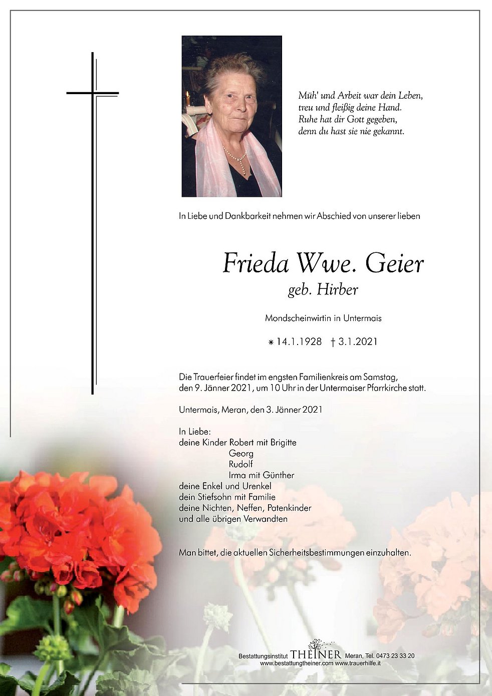 Die Trauerfeier findet im engsten Familienkreis am Samstag, den 9. Jänner 2021, um 10 Uhr in der Untermaiser Pfarrkirche statt.