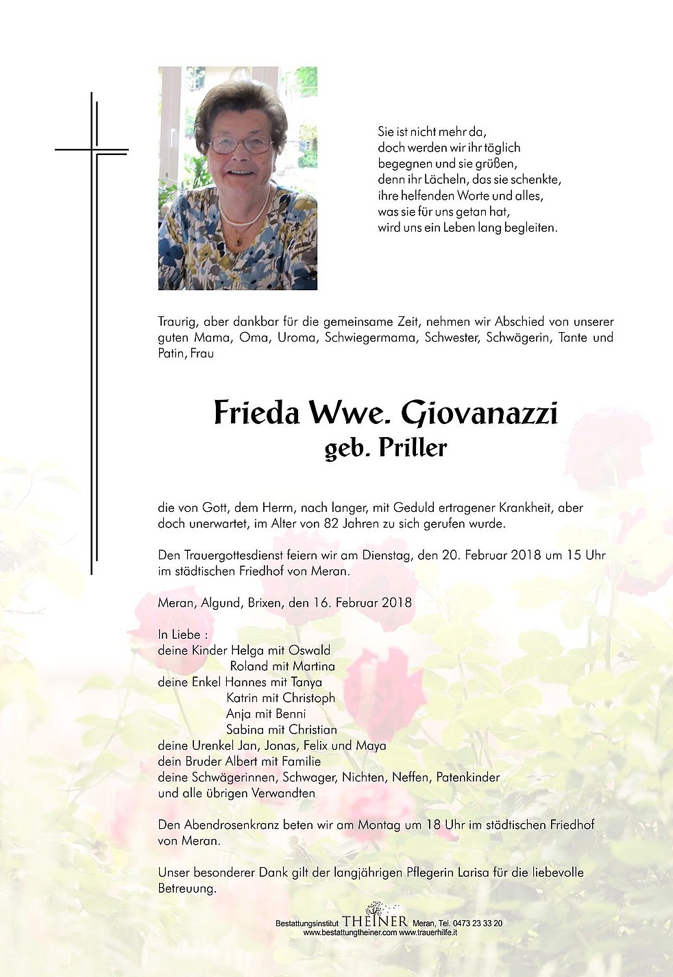 Den Trauergottesdienst feiern wir am Dienstag, den 20. Februar 2018 um 15 Uhr im städtischen Friedhof von Meran.