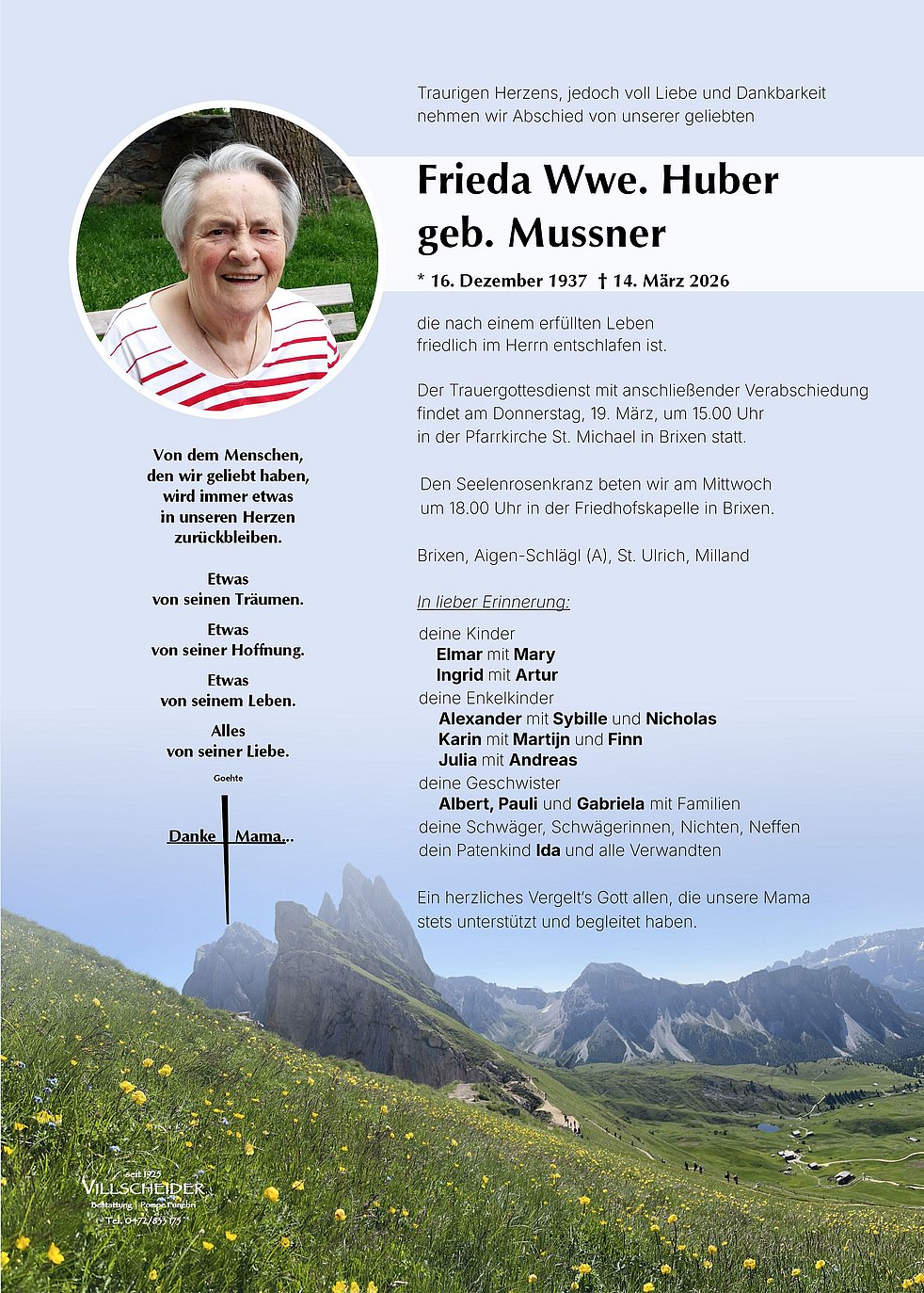 Begräbnisgottesdienst: 19.03. - 15:00 Uhr Brixen