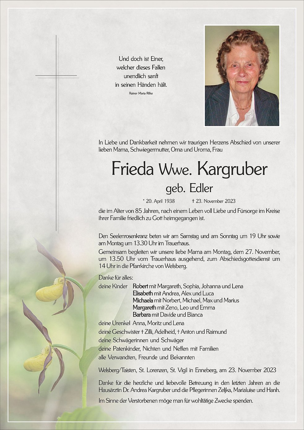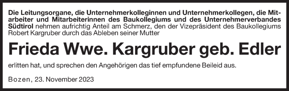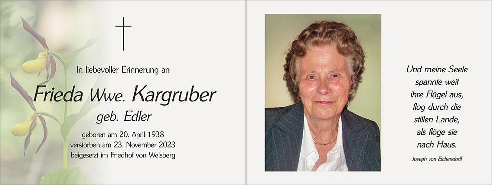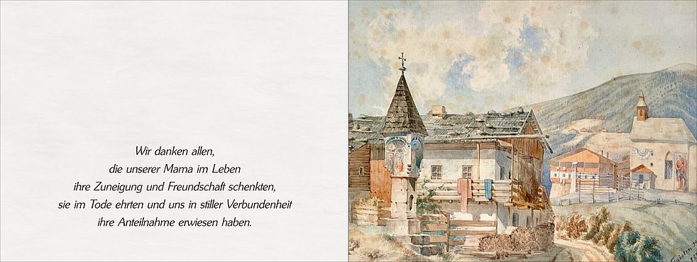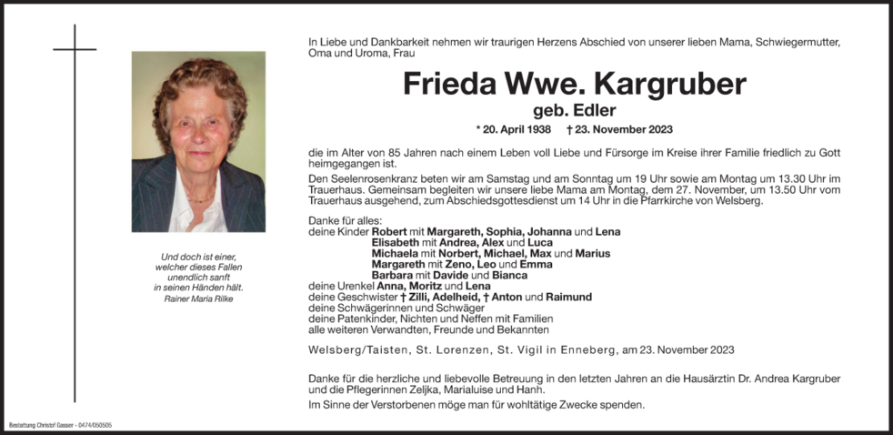 Gemeinsam begleiten wir unsere liebe Mama am Montag, dem 27. November, um 13.50 Uhr vom Trauerhaus ausgehend, zum Abschiedsgottesdienst um 14 Uhr in die Pfarrkirche von Welsberg.