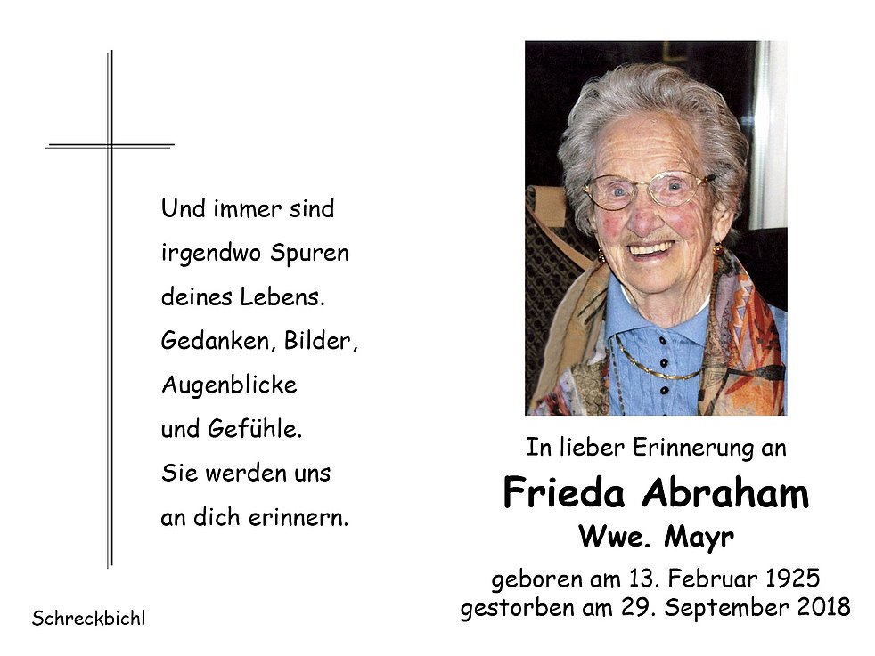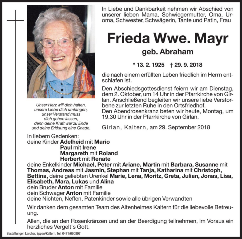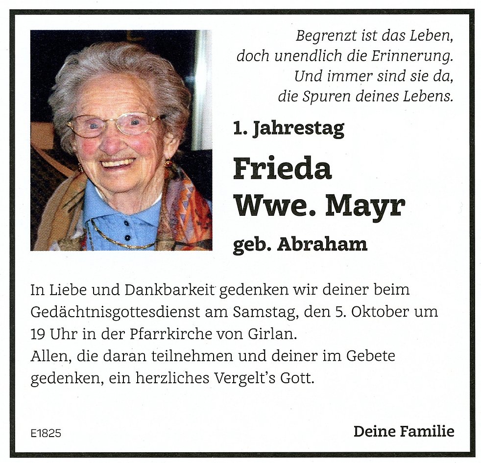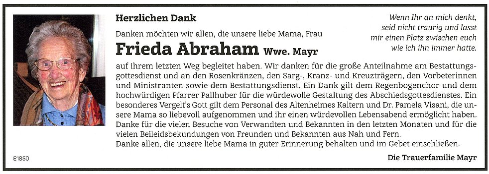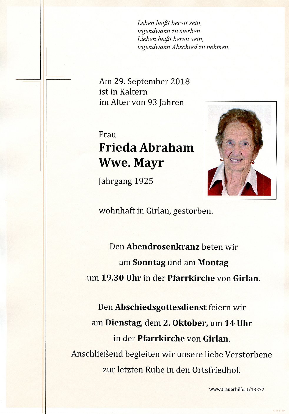 Den Abschiedsgottesdienst feiern wir am Dienstag, dem 2. Oktober um 14 Uhr in der Pfarrkirche von Girlan. Anschließend begleiten wir unsere liebe Verstorbene zur letzten Ruhe in den Ortsfriedhof.