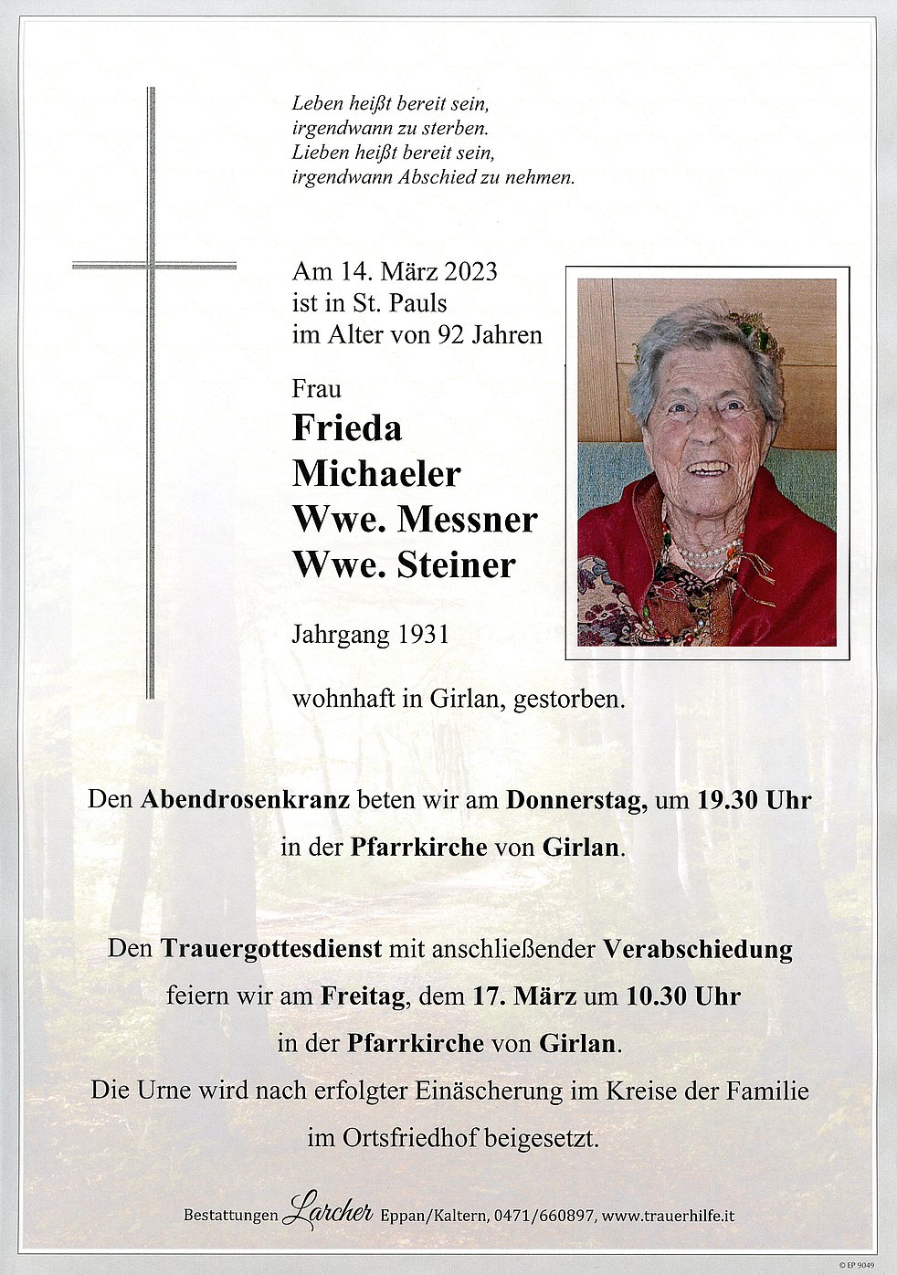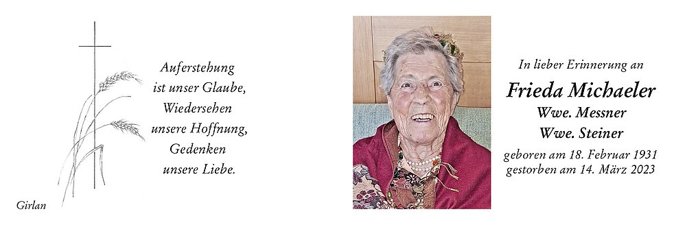 Den Trauergottesdienst mit anschließender Verabschiedung feiern wir am Freitag, dem 17. März um 10.30 Uhr in der Pfarrkirche von Girlan.