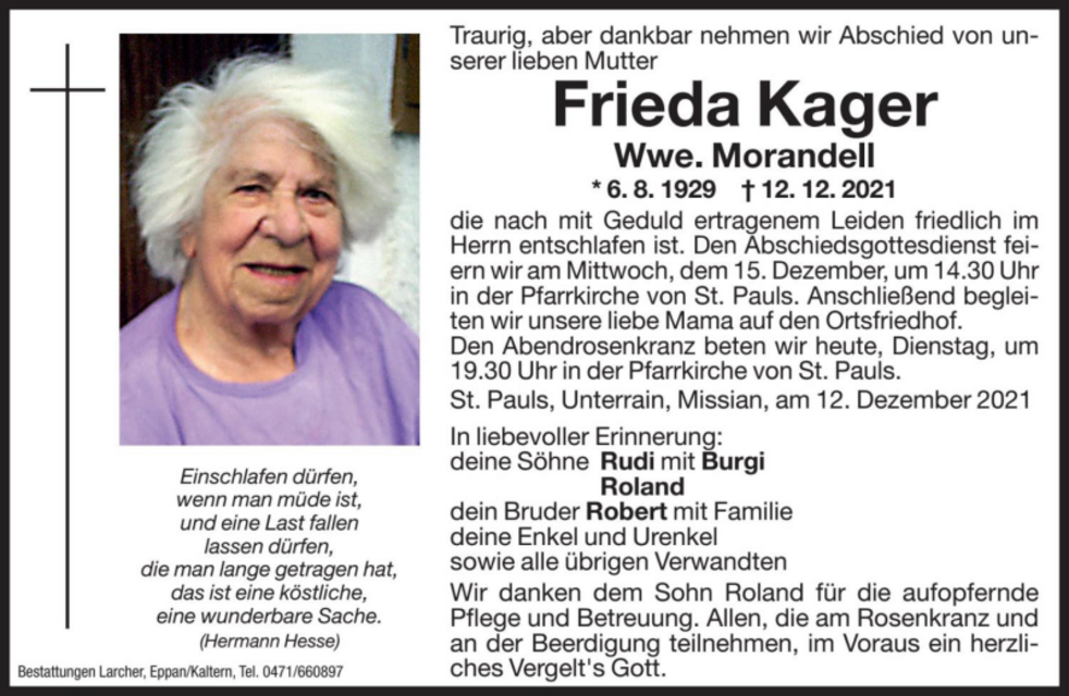 Den Abschiedsgottesdienst feiern wir am Mittwoch, dem 15. Dezember um 14.30 Uhr in der Pfarrkirche von St. Pauls. Anschließend begleiten wir unsere liebe Mama auf den Ortsfriedhof.