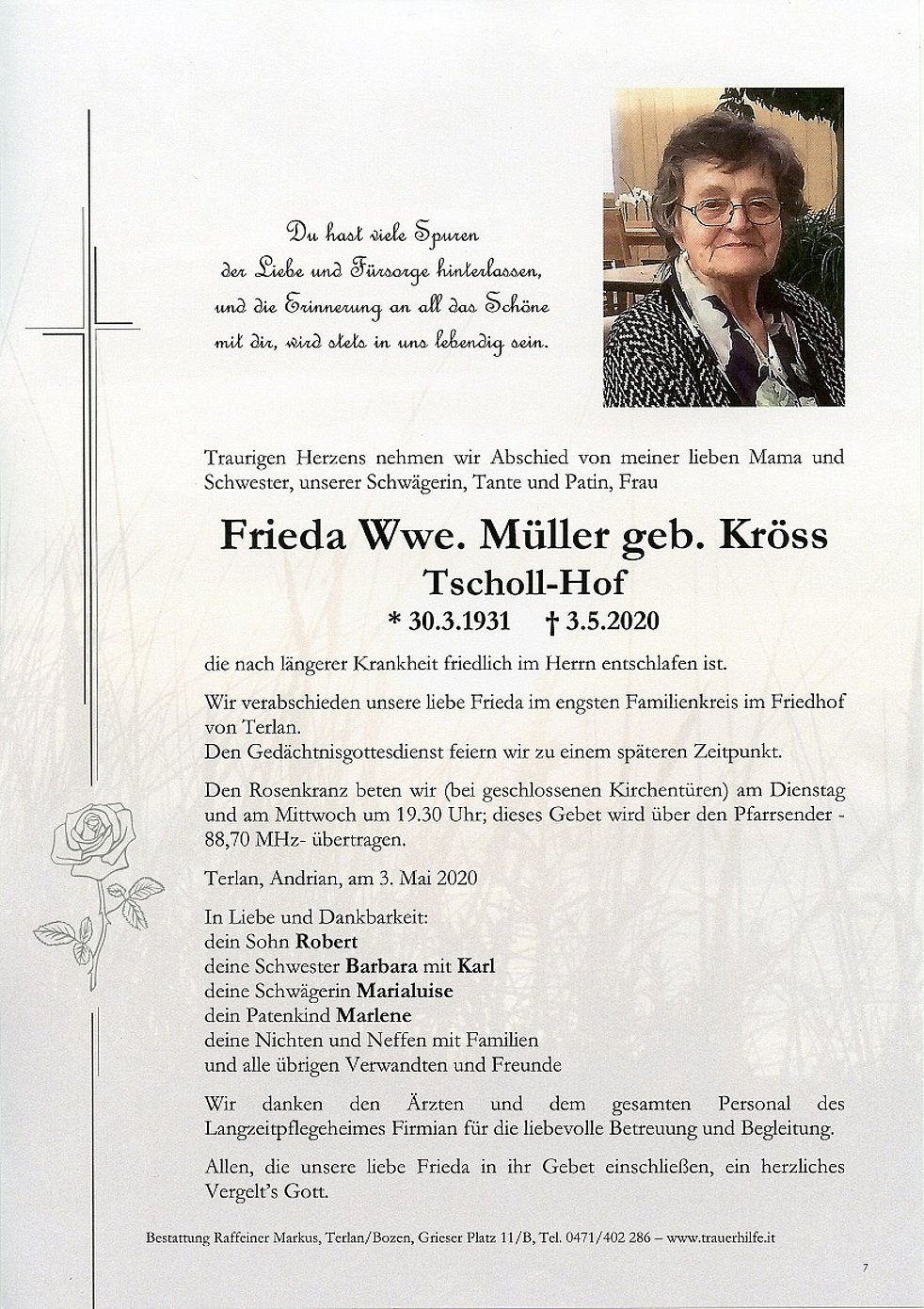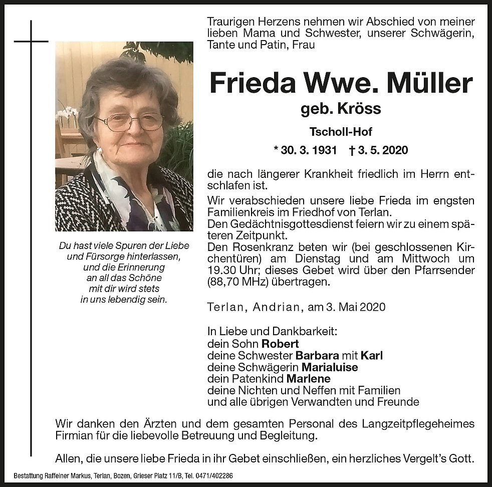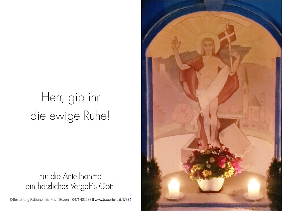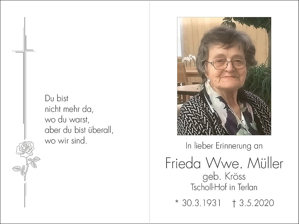 Wir verabschieden unsere liebe Frieda im engsten Familienkreis im Friedhof von Terlan.