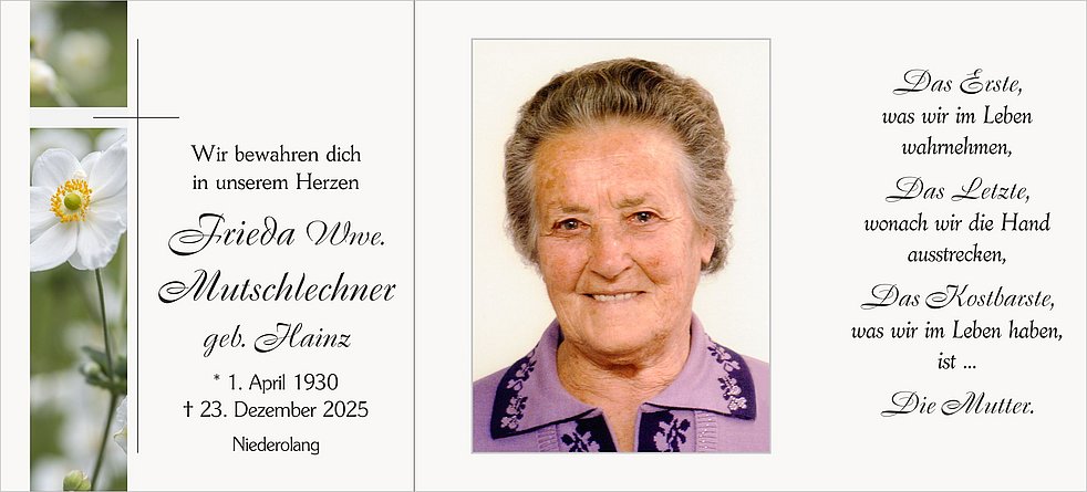 In Liebe und Dankbarkeit nehmen wir Abschied von unserer lieben Mutter, Schwiegermutter, Oma und Uroma, Frau