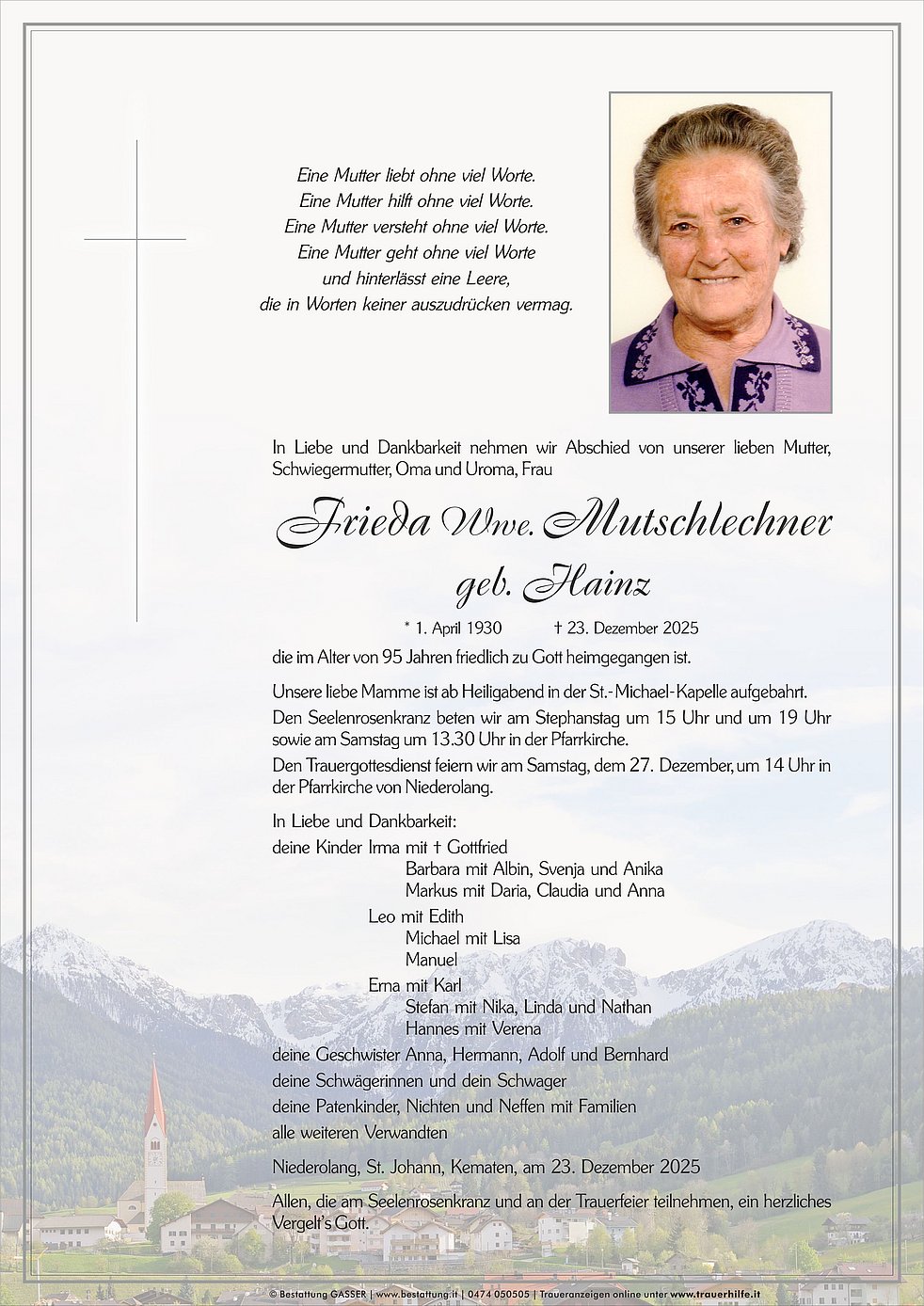 Den Trauergottesdienst feiern wir am Samstag, dem 27. Dezember, um 14 Uhr in der Pfarrkirche von Niederolang.