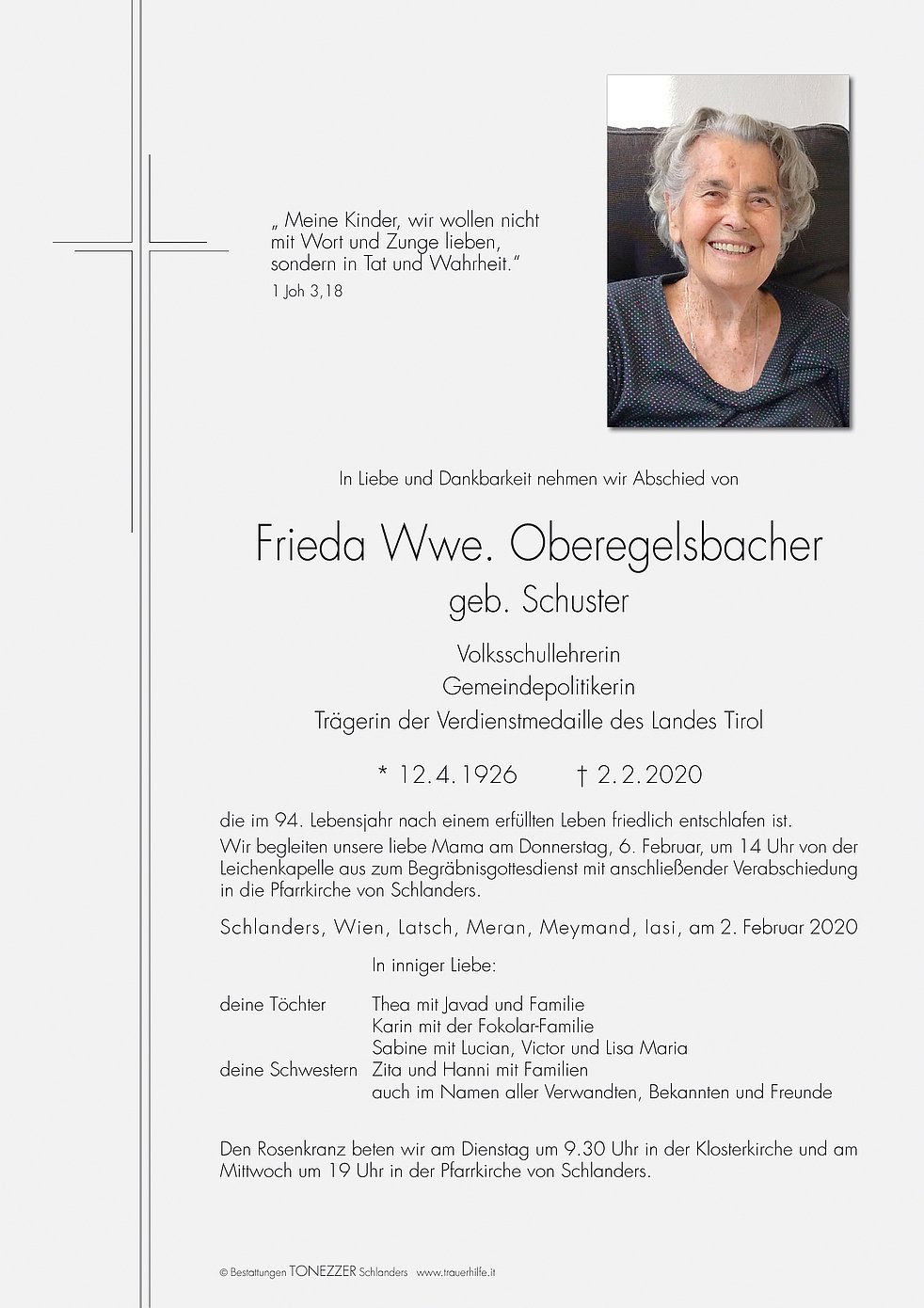 Wir begleiten unsere liebe Mama am Donnerstag, 6. Februar, um 14 Uhr von der Leichenkapelle aus zum Begräbnisgottesdienst mit anschließender Verabschiedung in die Pfarrkirche von Schlanders.