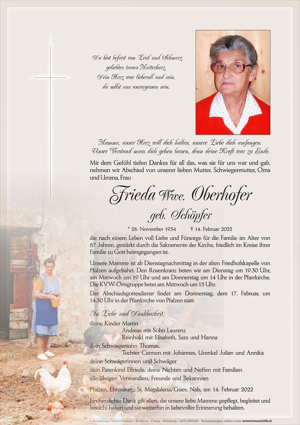 Unsere Mamme ist ab Dienstagnachmittag in der alten Friedhofskapelle von Pfalzen aufgebahrt. Den Rosenkranz beten wir am Dienstag um 19.30 Uhr, am Mittwoch um 19 Uhr und am Donnerstag um 14 Uhr in der Pfarrkirche. Die KVW-Ortsgruppe betet am Mittwoch um 15 Uhr.
