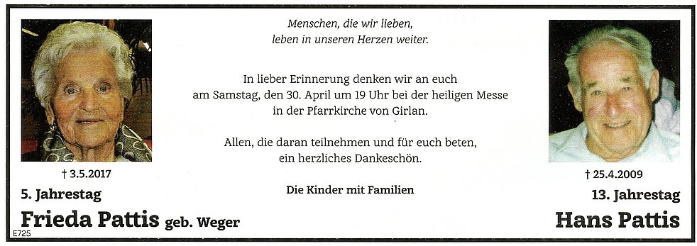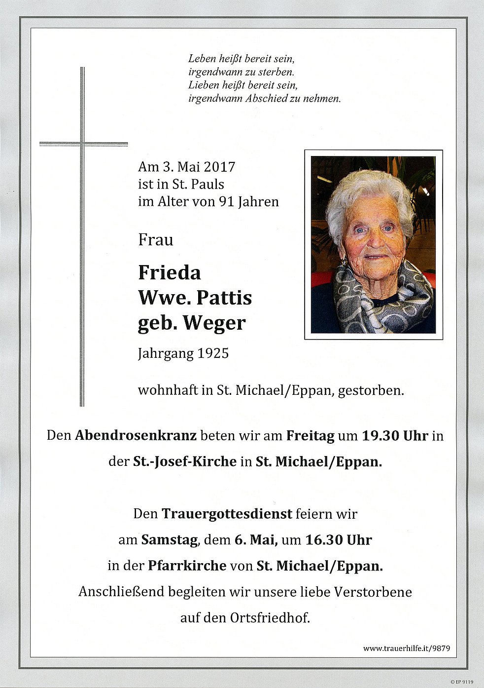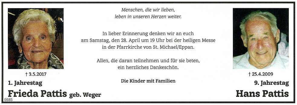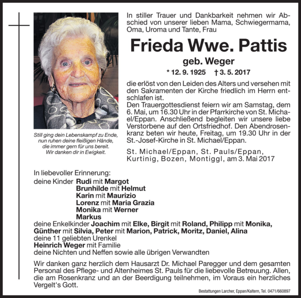 Den Trauergottesdienst feiern wir am Samstag, dem 6. Mai um 16.30 Uhr in der Pfarrkirche von St. Michael/Eppan. Anschließend begleiten wir unsere liebe Verstorbene auf den Ortsfriedhof.