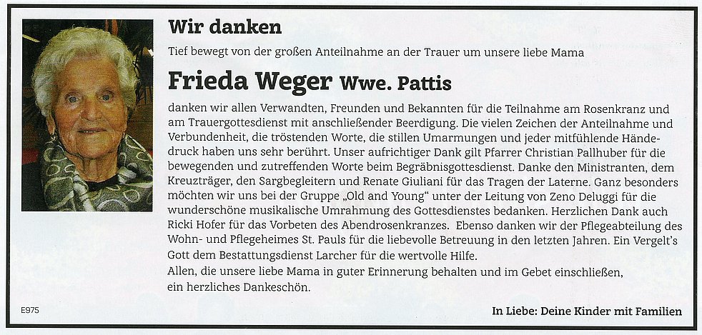 Wir danken ganz herzlich dem Hausarzt Dr. Michael Paregger und dem gesamten Personal des Pflege- und Altenheimes St. Pauls für die liebevolle Betreuung.