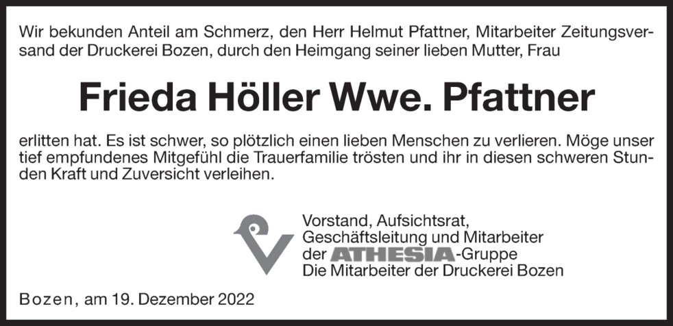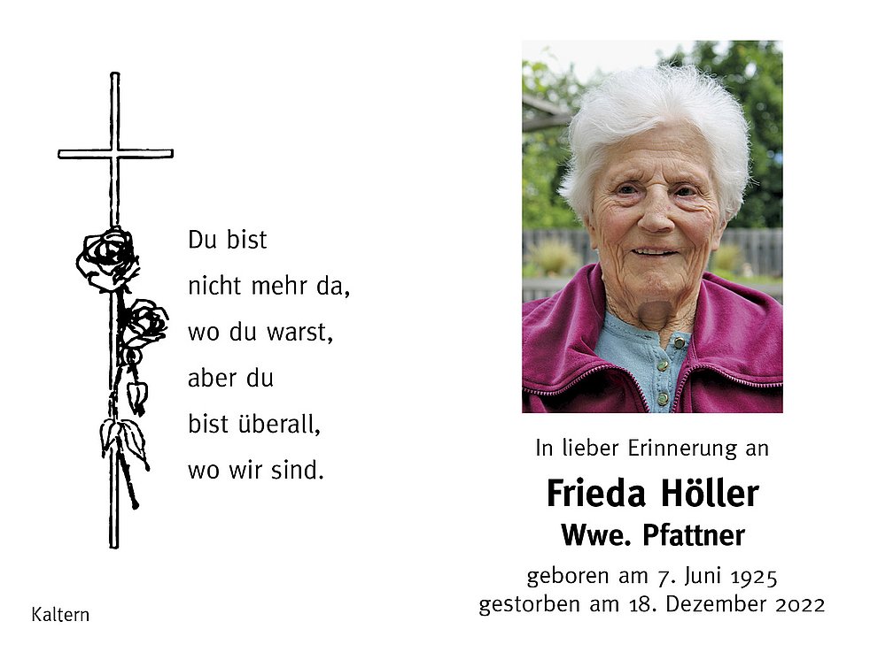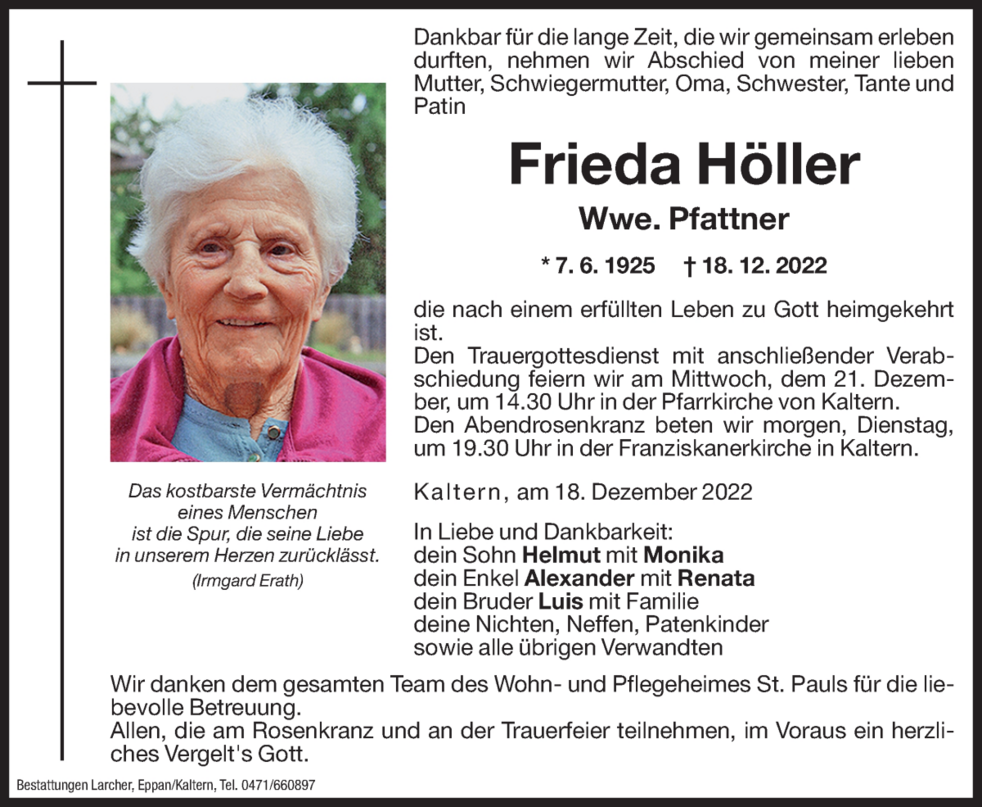 Den Trauergottesdienst mit anschließender Verabschiedung feiern wir am Mittwoch, dem 21. Dezember um 14.30 Uhr in der Pfarrkirche von Kaltern.
