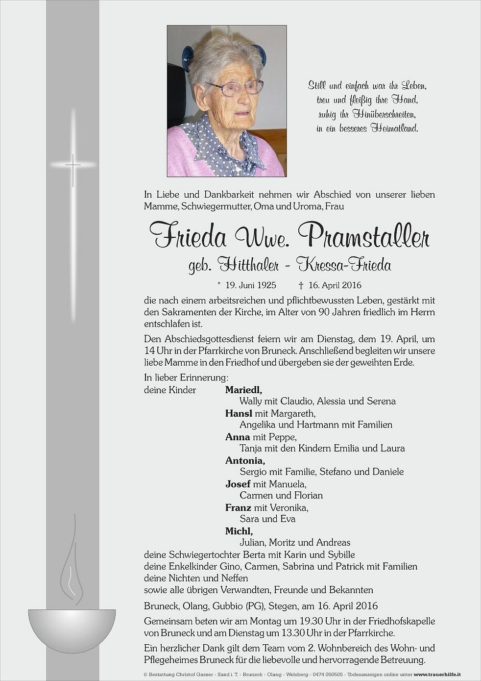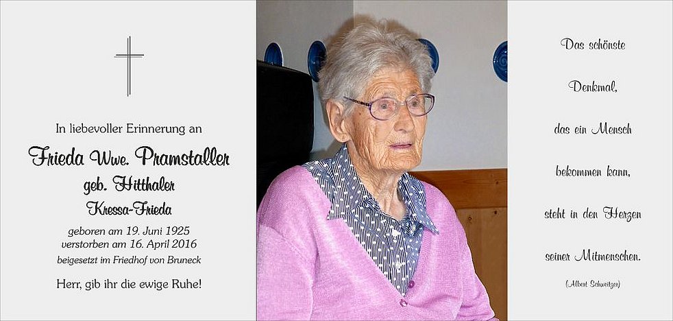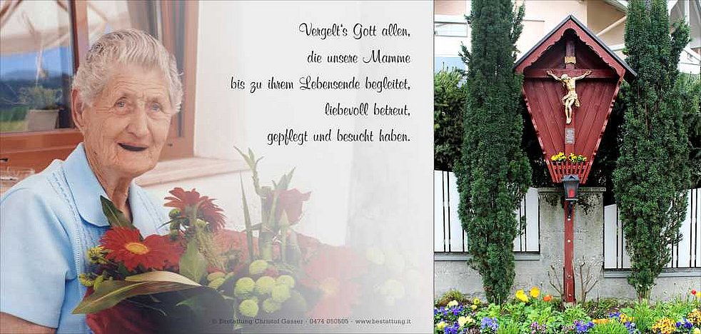 14 Uhr in der Pfarrkirche von Bruneck. Anschließend begleiten wir unsere liebe Mamme in den Friedhof und übergeben sie der geweihten Erde.