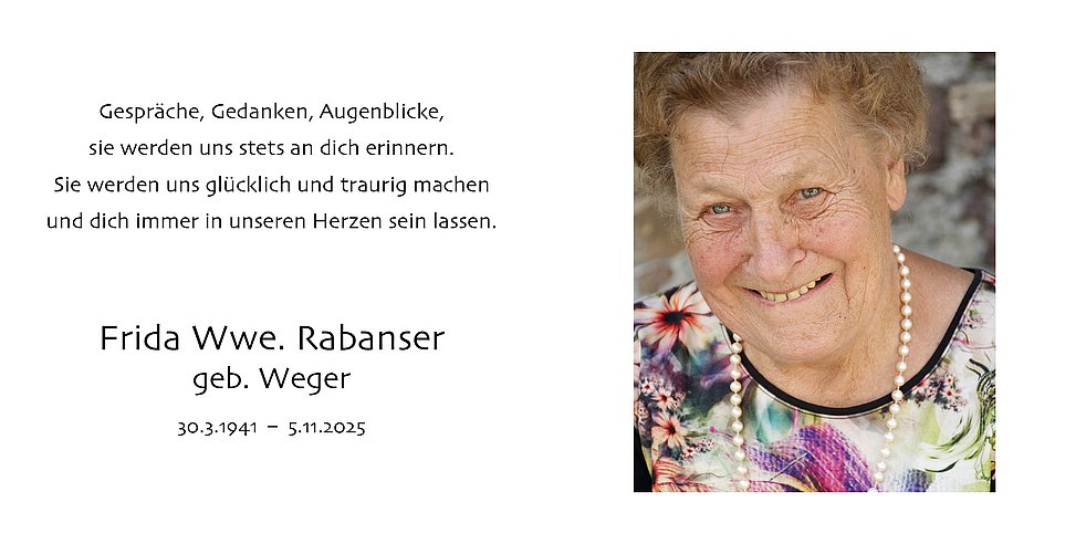 Den Abschiedsgottesdienst feiern wir am Freitag, dem 7. November, um 14.30 Uhr in der Pfarrkirche von St. Michael/Eppan. Anschließend begleiten wir unsere liebe Verstorbene zur letzten Ruhe auf den Ortsfriedhof.