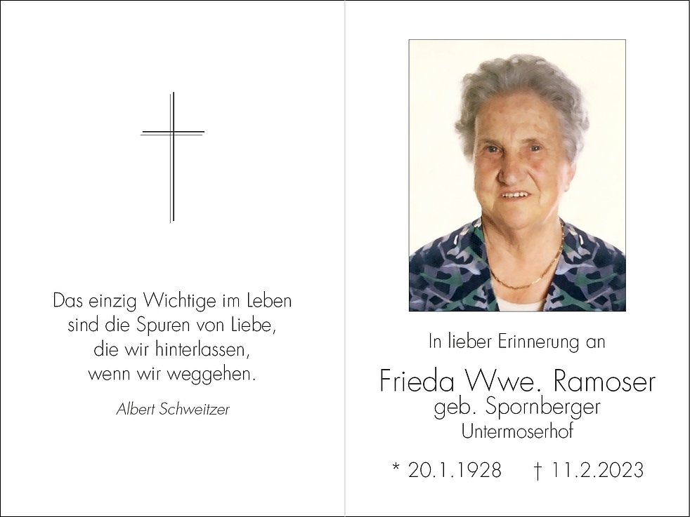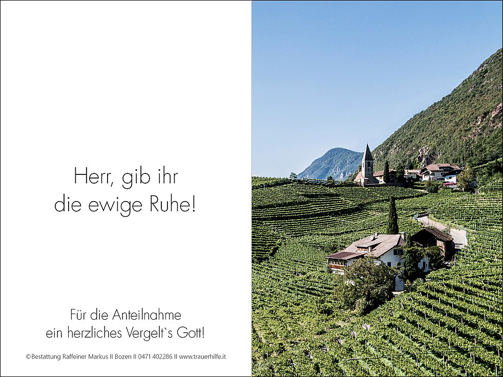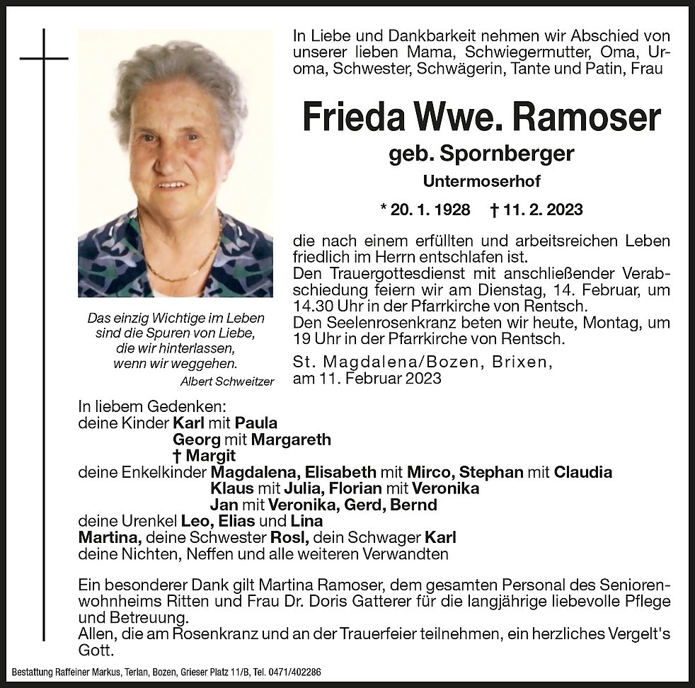 Ein besonderer Dank gilt Martina Ramoser, dem gesamten Personal des Seniorenwohnheims Ritten und Frau Dr. Doris Gatterer für die langjährige liebevolle Pflege und Betreuung.