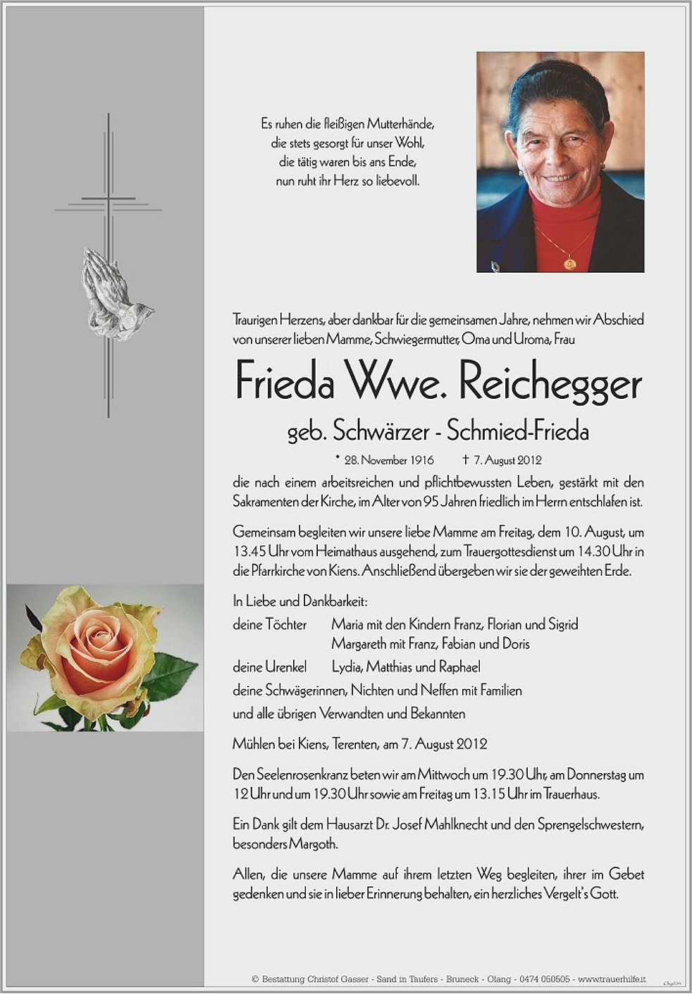 Heute erfuhr ich die traurige Nachricht, vom Heimgang der lieben Frau Reichegger Frieda. Möchte der Familie, Angehörigen, Verwandten, meine herzlichste Anteilnahme aussprechen.