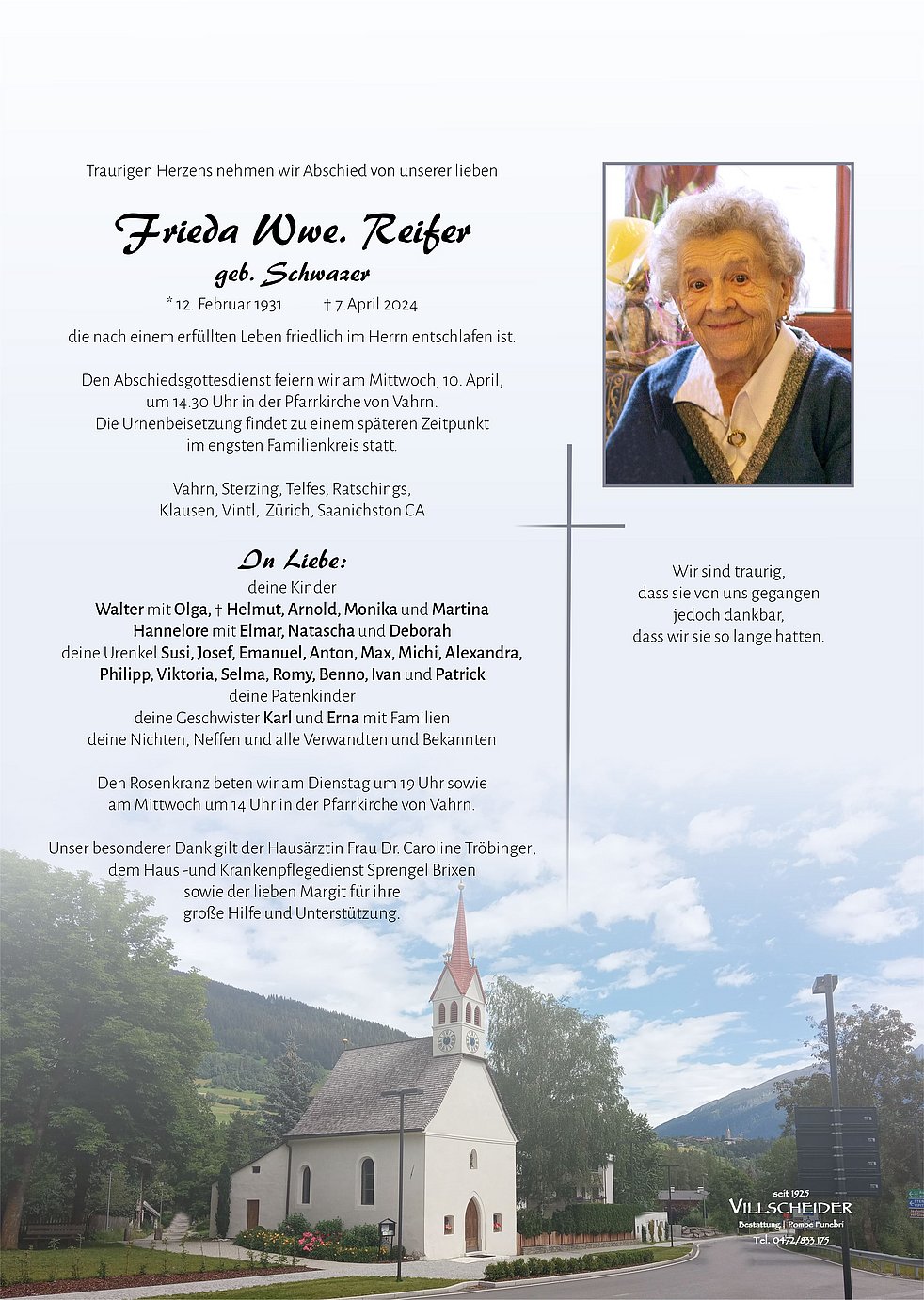 Trauerfeier: 10.04. - 14:30 Uhr Vahrn