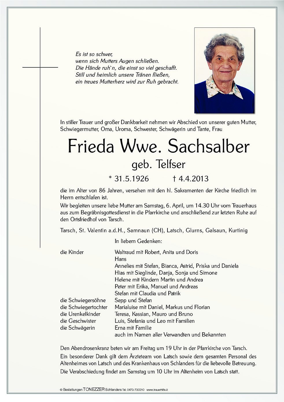 Wir begleiten unsere liebe Mutter am Samstag, 6. April, um 14.30 Uhr vom Trauerhaus aus zum Begräbnisgottesdienst in die Pfarrkirche und anschließend zur letzten Ruhe auf den Ortsfriedhof von Tarsch.