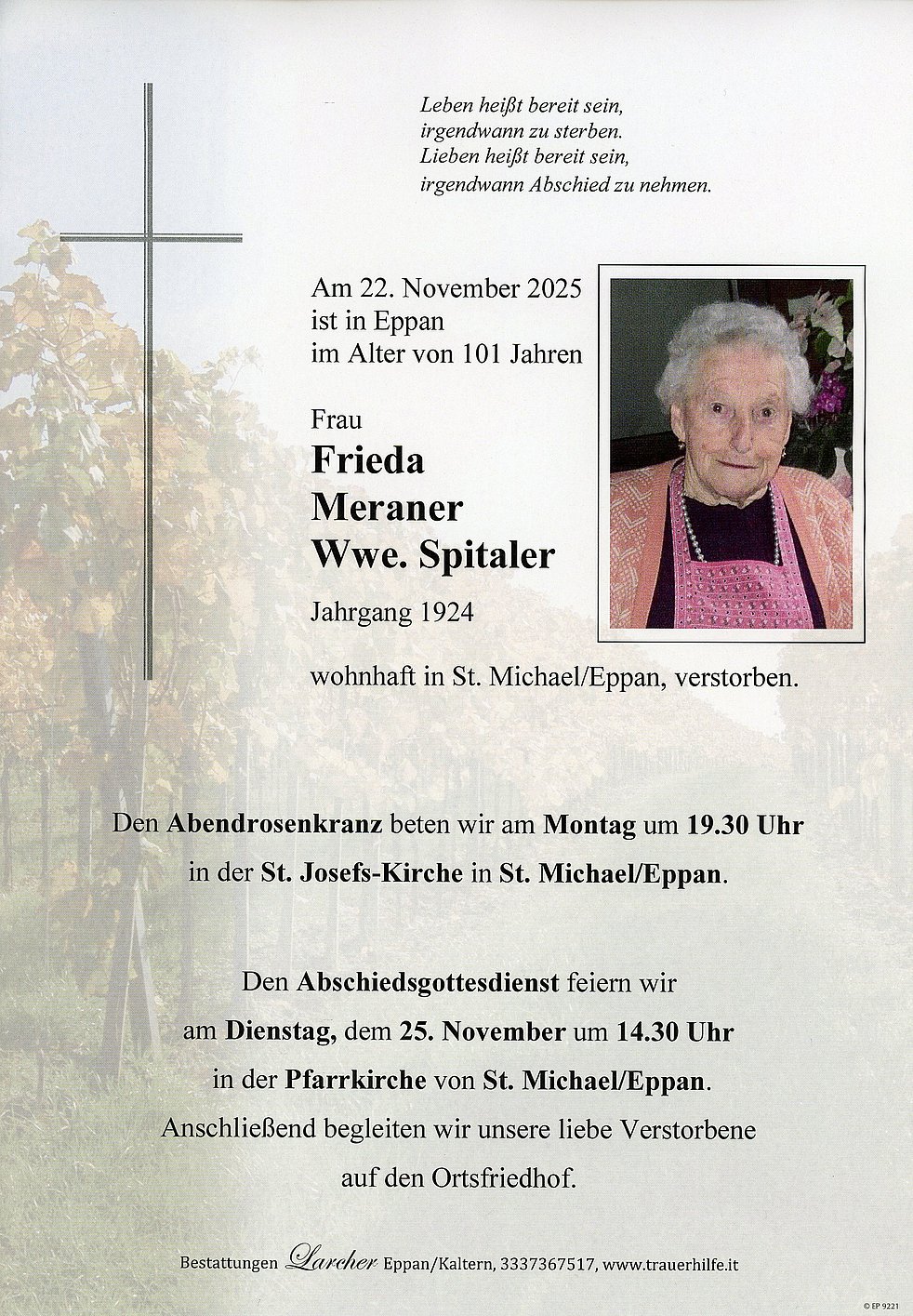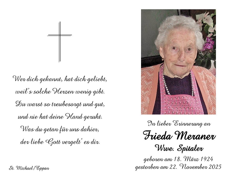 Den Abschiedsgottesdienst feiern wir am Dienstag, dem 25. November, um 14.30 Uhr in der Pfarrkirche von St. Michael/Eppan. Anschließend begleiten wir unsere liebe Frieda auf den Ortsfriedhof.