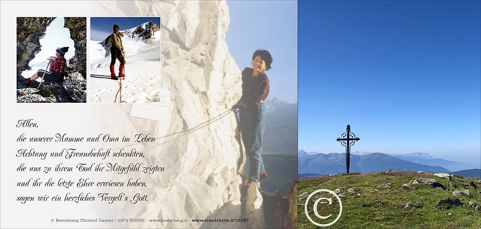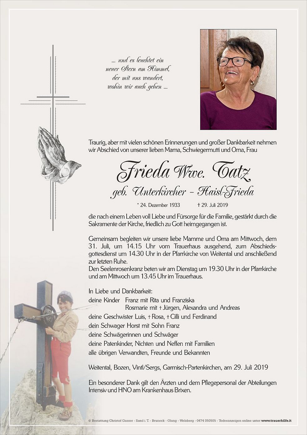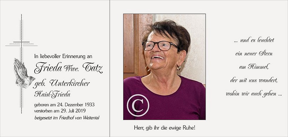 Gemeinsam begleiten wir unsere liebe Mamme und Oma am Mittwoch, dem 31. Juli, um 14.15 Uhr vom Trauerhaus ausgehend, zum Abschieds-gottesdienst um 14.30 Uhr in der Pfarrkirche von Weitental und anschließend zur letzten Ruhe.