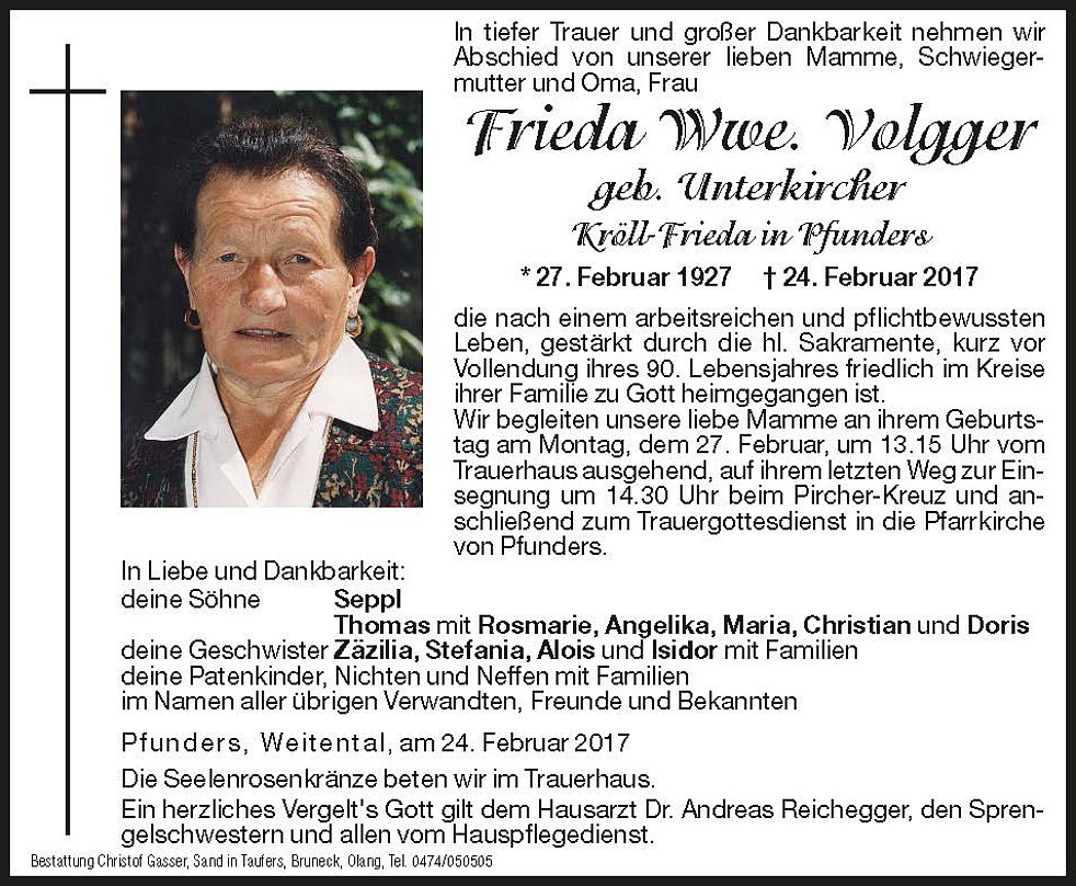 Wir begleiten unsere liebe Mamme an ihrem Geburtstag am Montag, dem 27. Februar, um 13.15 Uhr vom Trauerhaus ausgehend, auf ihrem letzten Weg zur Einsegnung um 14.30 Uhr beim Pircher-Kreuz und anschließend zum Trauergottesdienst in die Pfarrkirche von Pfunders.
