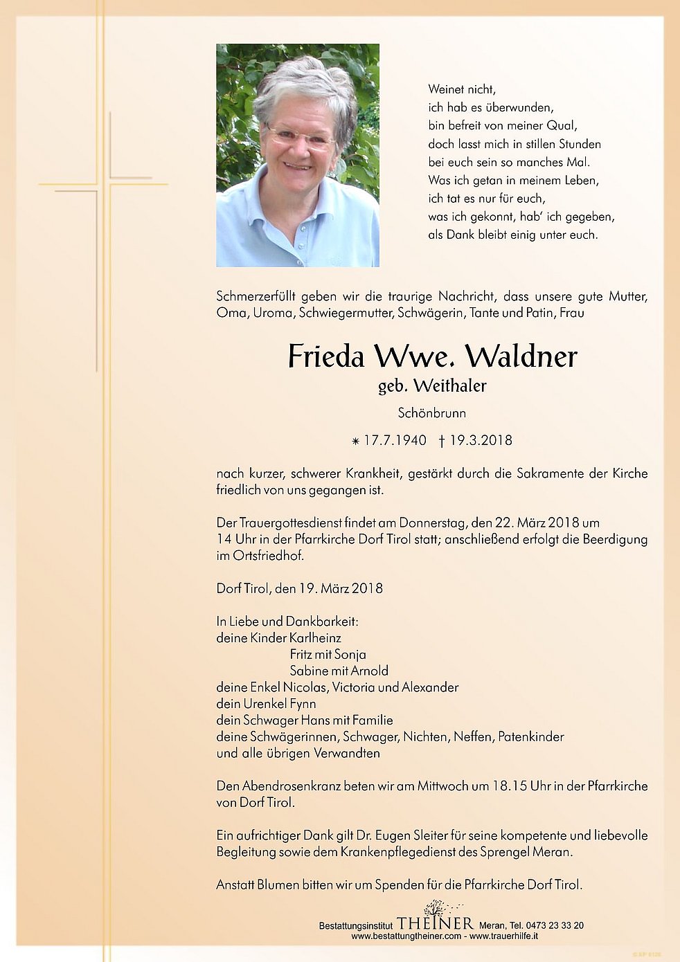 Der Trauergottesdienst findet am Donnerstag, den 22. März 2018 um 14 Uhr in der Pfarrkirche Dorf Tirol statt; anschließend erfolgt die Beerdigung im Ortsfriedhof.