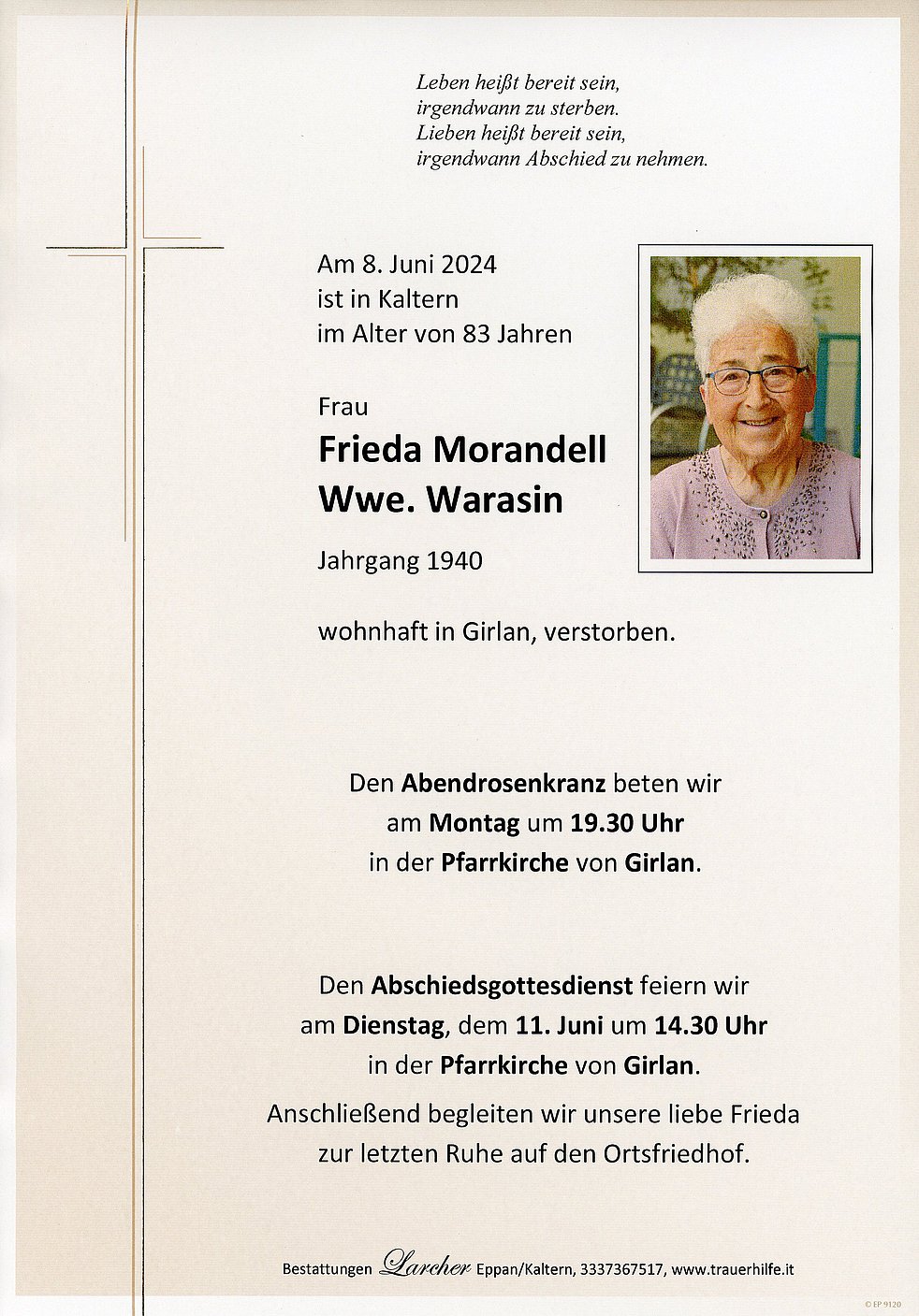 Den Abschiedsgottesdienst feiern wir am Dienstag, dem 11. Juni um 14.30 Uhr in der Pfarrkirche von Girlan. Anschließend begleiten wir unsere liebe Verstorbene zur letzten Ruhe auf den Ortsfriedhof.