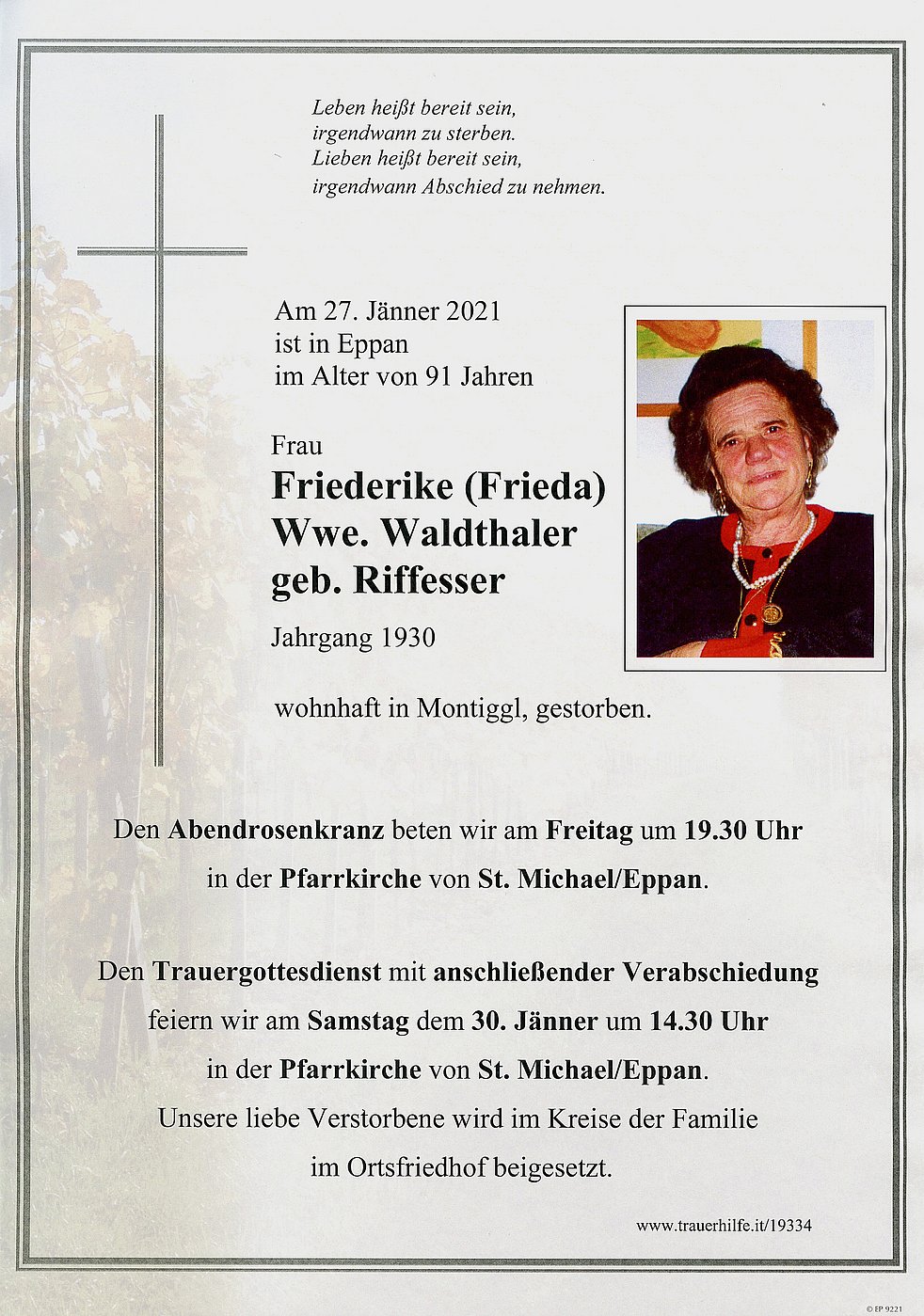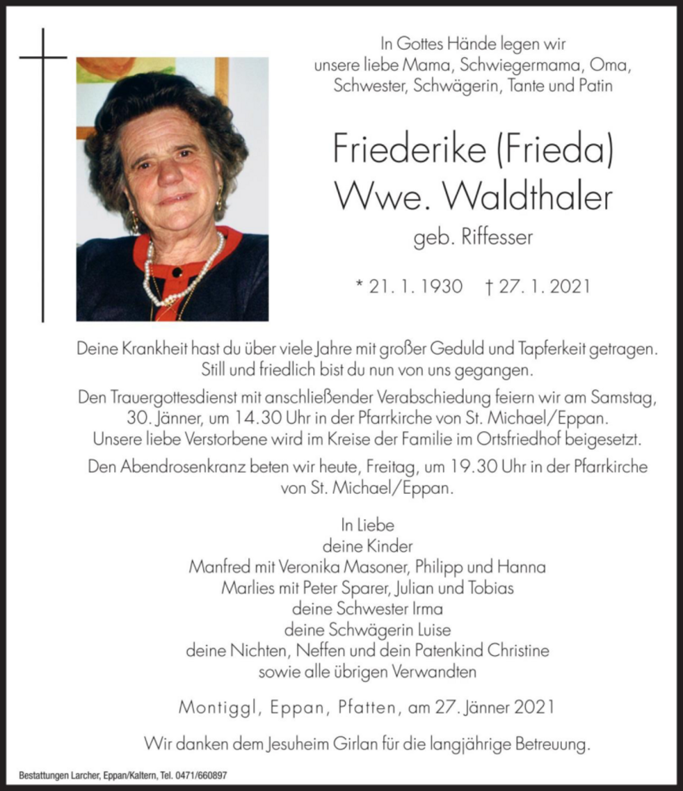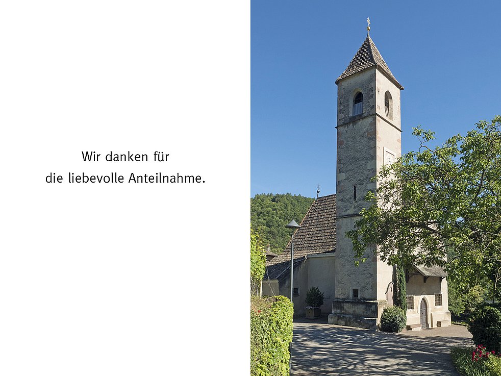 Den Trauergottesdienst mit anschließender Verabschiedung feiern wir am Samstag, dem 30. Jänner um 14.30 Uhr in der Pfarrkirche von St. Michael/Eppan.